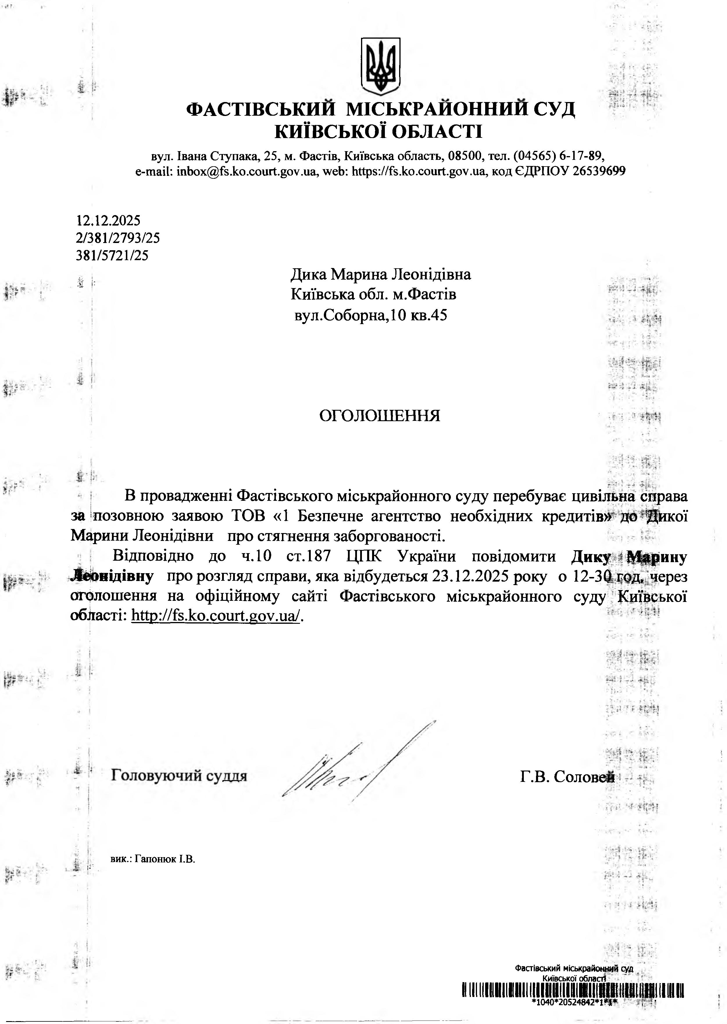 Дика Марина Леонідівна Київська обл. м.Фастів вул.Соборна, 10 кв.45