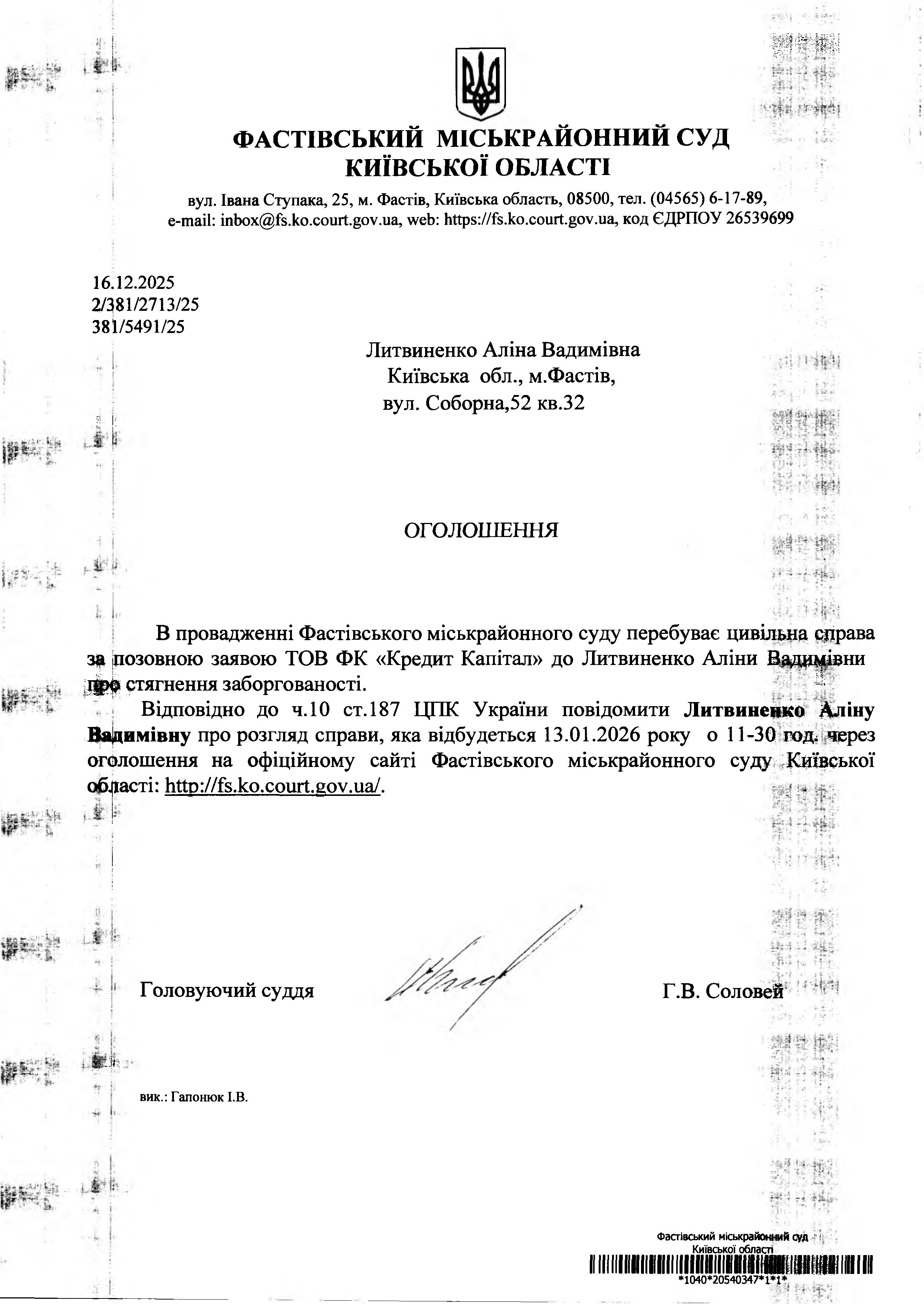 Литвиненко Аліна Вадимівна Київська обл., м.Фастів, вул. Соборна,52 кв.32