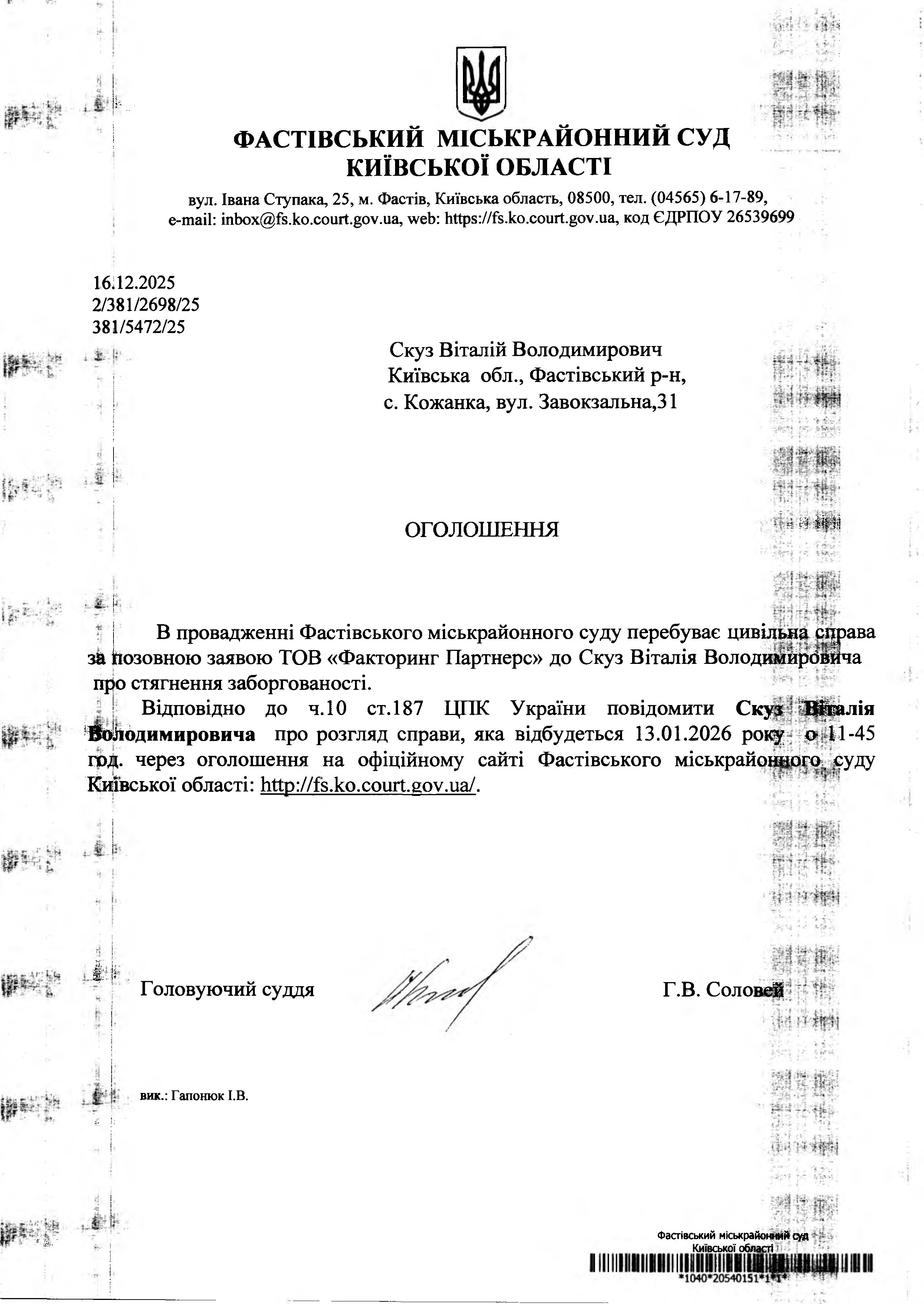 Скуз Віталій Володимирович Київська обл., Фастівський р-н, с. Кожанка, вул. Завокзальна,31