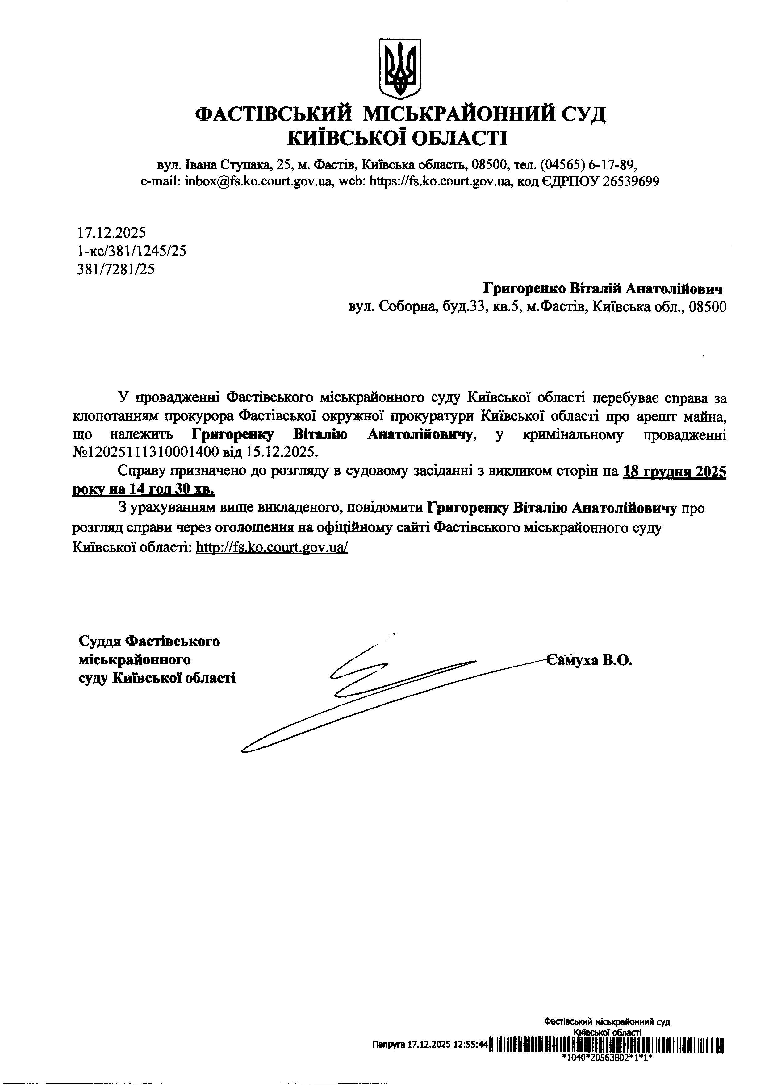 Григоренко Віталій Анатолійович вул. Соборна, буд.ЗЗ, кв.5, м.Фастів, Київська обл., 08500
