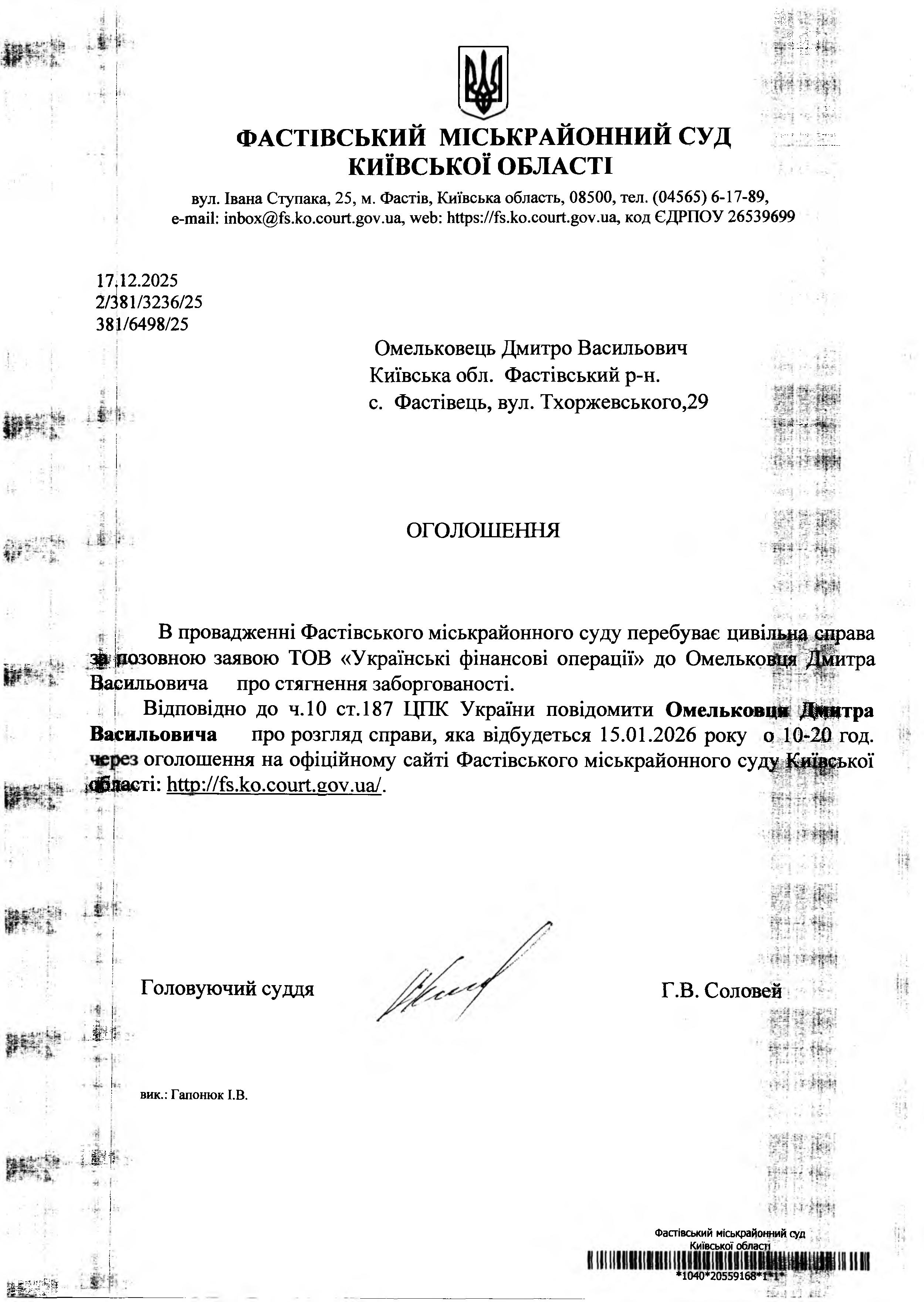 Омельковець Дмитро Васильович Київська обл. Фастівський р-н. с. Фастівець, вул. Тхоржевського,29