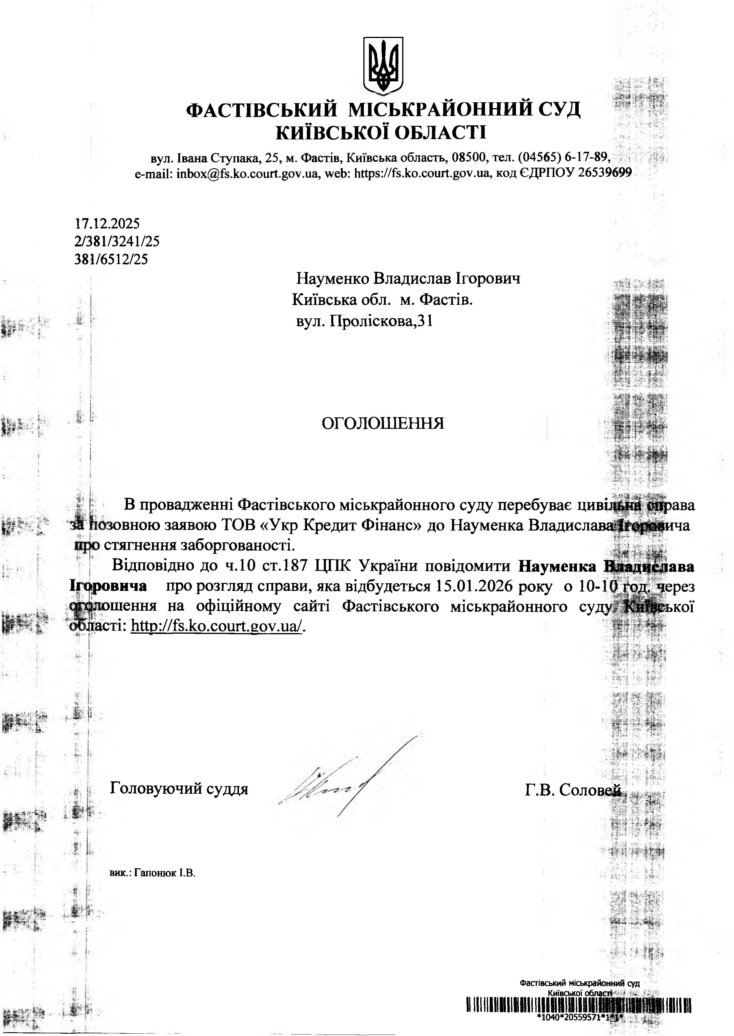 Науменко Владислав Ігорович Київська обл. м. Фастів, вул. Проліскова,31