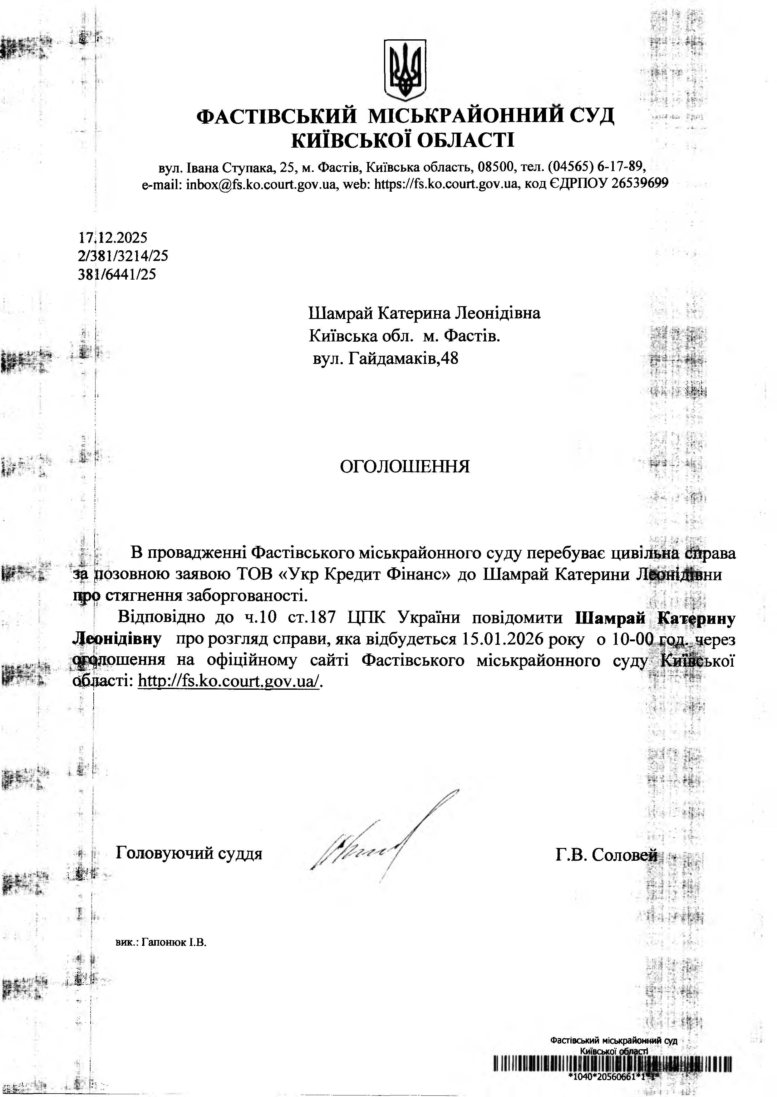 Шамрай Катерина Леонідівна Київська обл. м. Фастів, вул. Гайдамаків,48