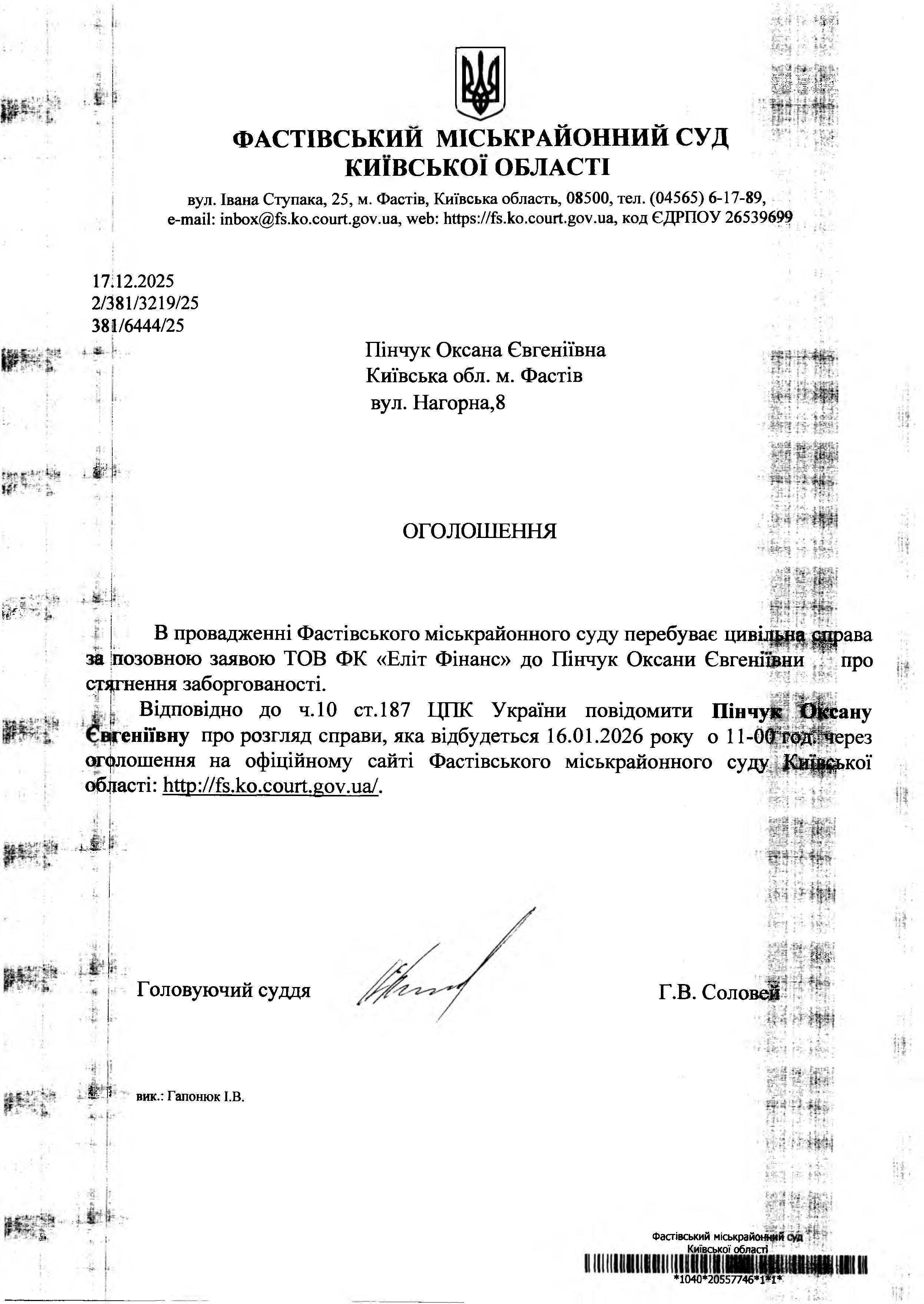 Пінчук Оксана Євгеніївна Київська обл. м. Фастів вул. Нагорна,8