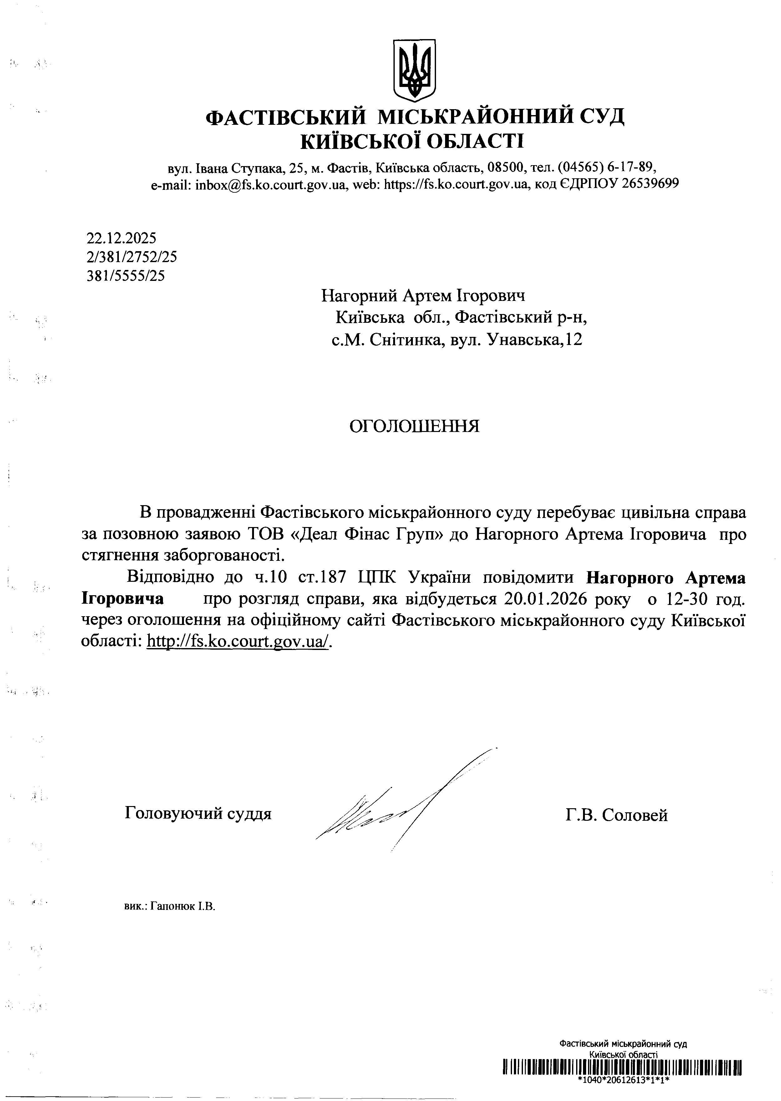 Нагорний Артем Ігорович Київська обл., Фастівський р-н, с.М. Снітинка, вул. Унавська,12