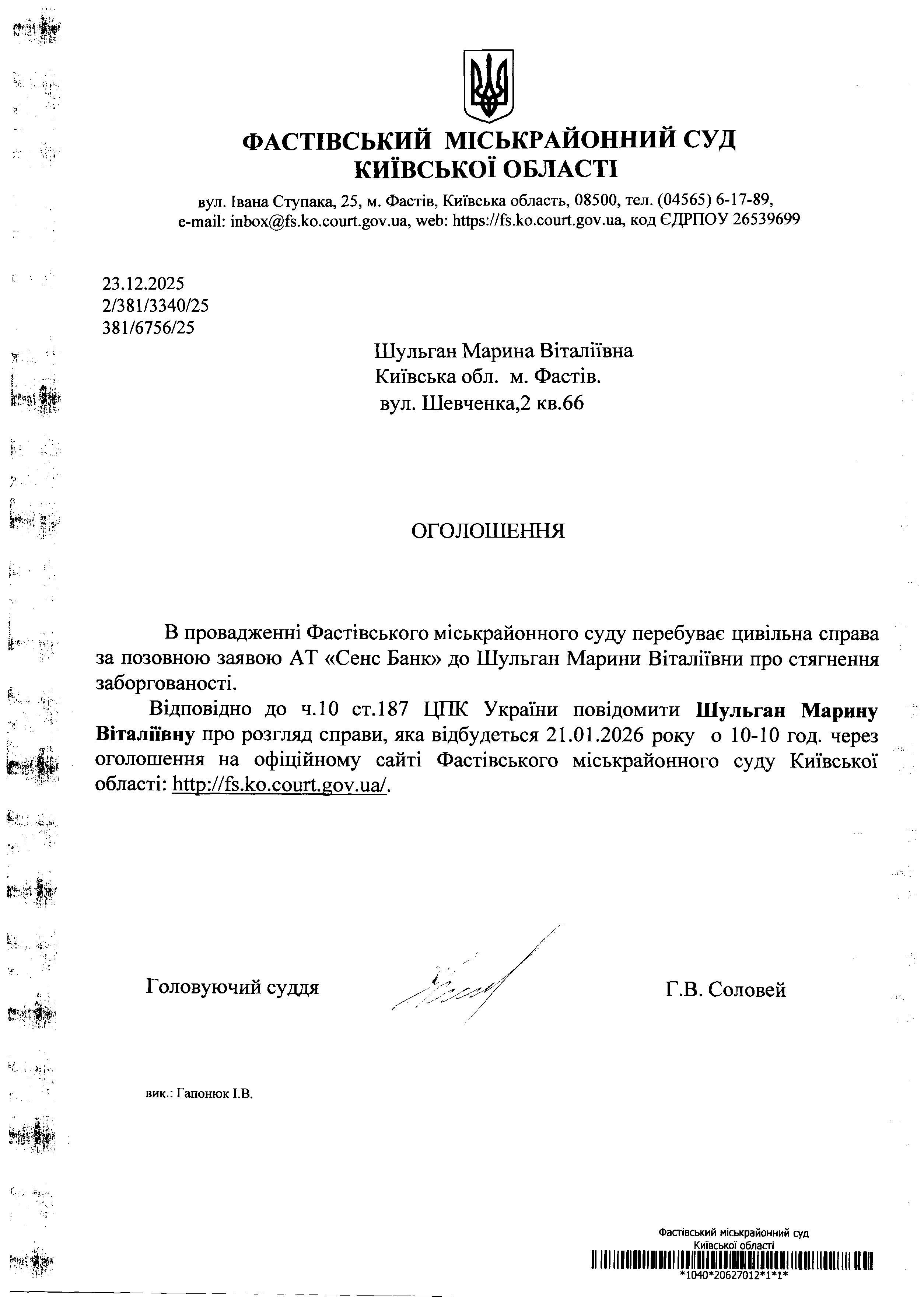 Шульган Марина Віталіївна Київська обл. м. Фастів, вул. Шевченка,2 кв.66