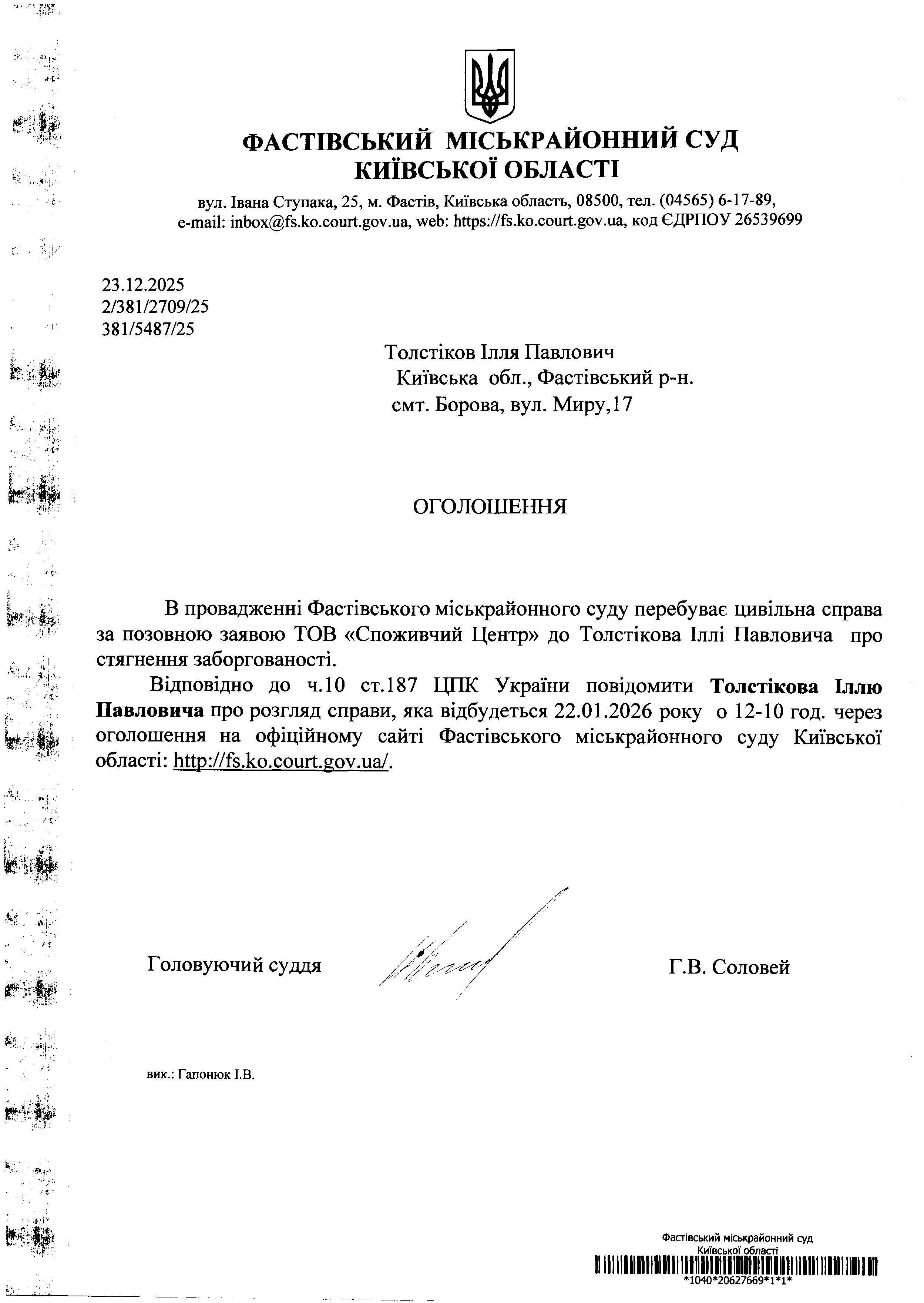 Толстіков Ілля Павлович Київська обл., Фастівський р-н. смт. Борова, вул. Миру, 17