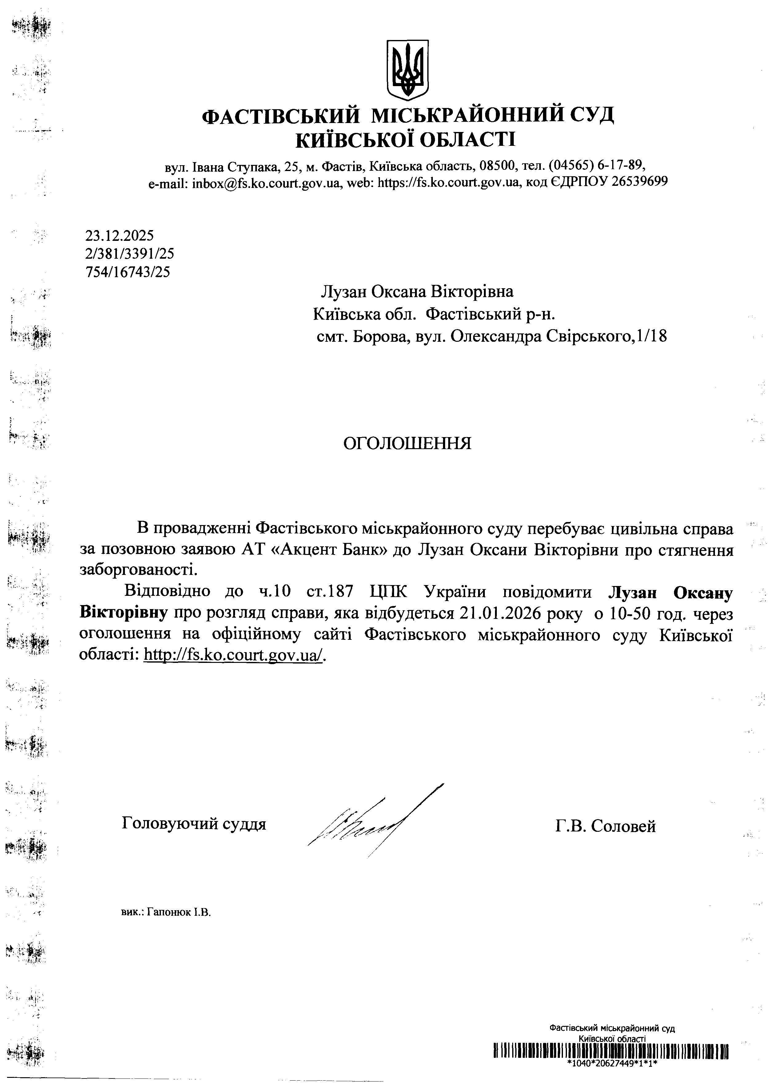 Лузан Оксана Вікторівна Київська обл. Фастівський р-н. смт. Борова, вул. Олександра Свірського,1/18