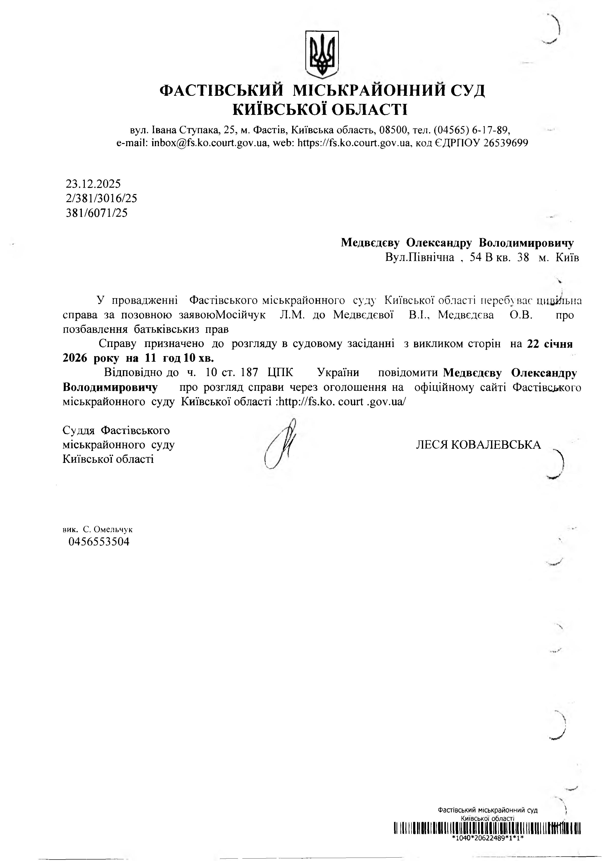 Медвєдєвій Вікторії Ігорівні Вул. Небесної Сотні, 8 кв. 11 м. Фастів