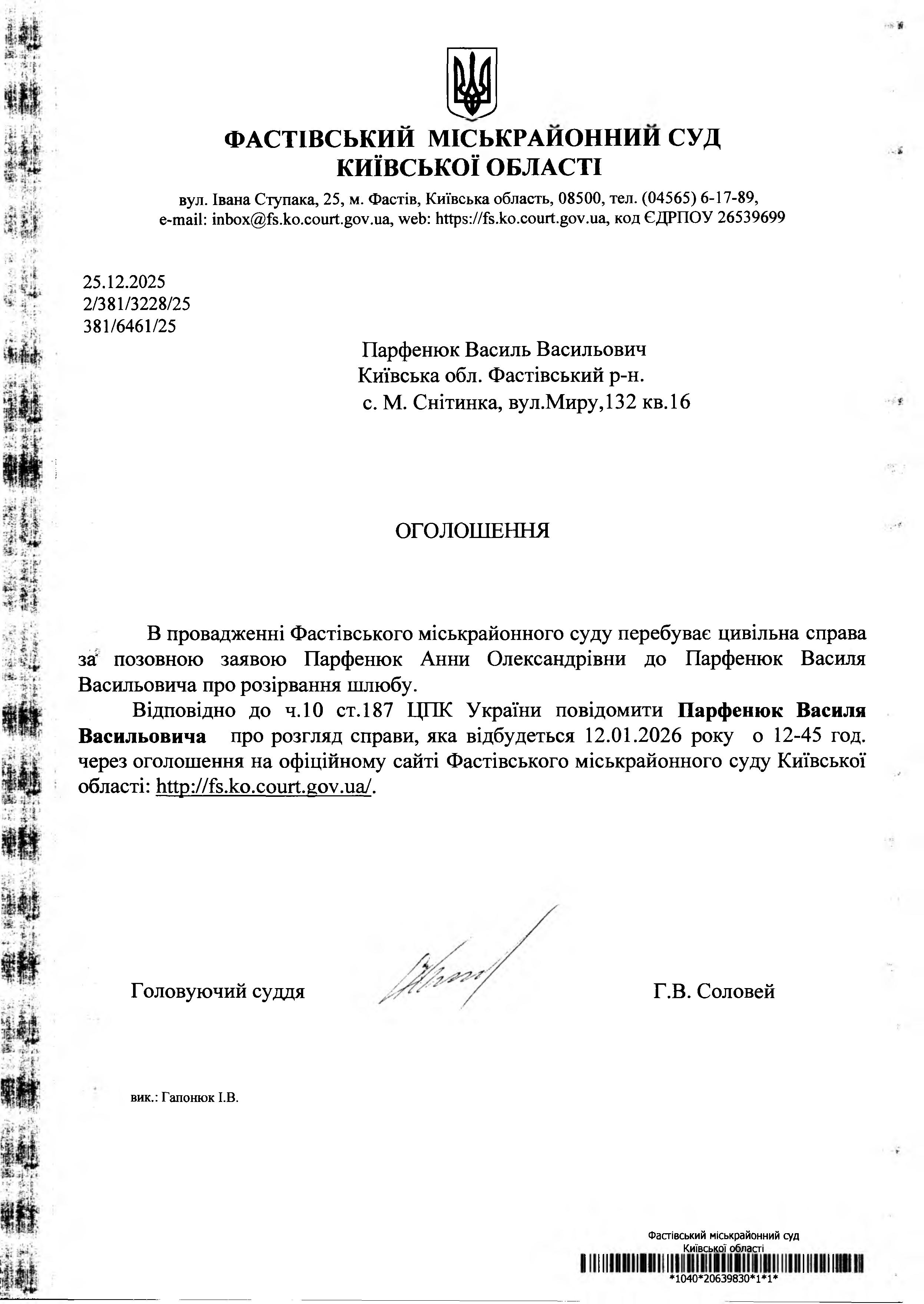 Парфенюк Василь Васильович Київська обл. Фастівський р-н. с. М. Снітинка, вул.Миру,132 кв.16