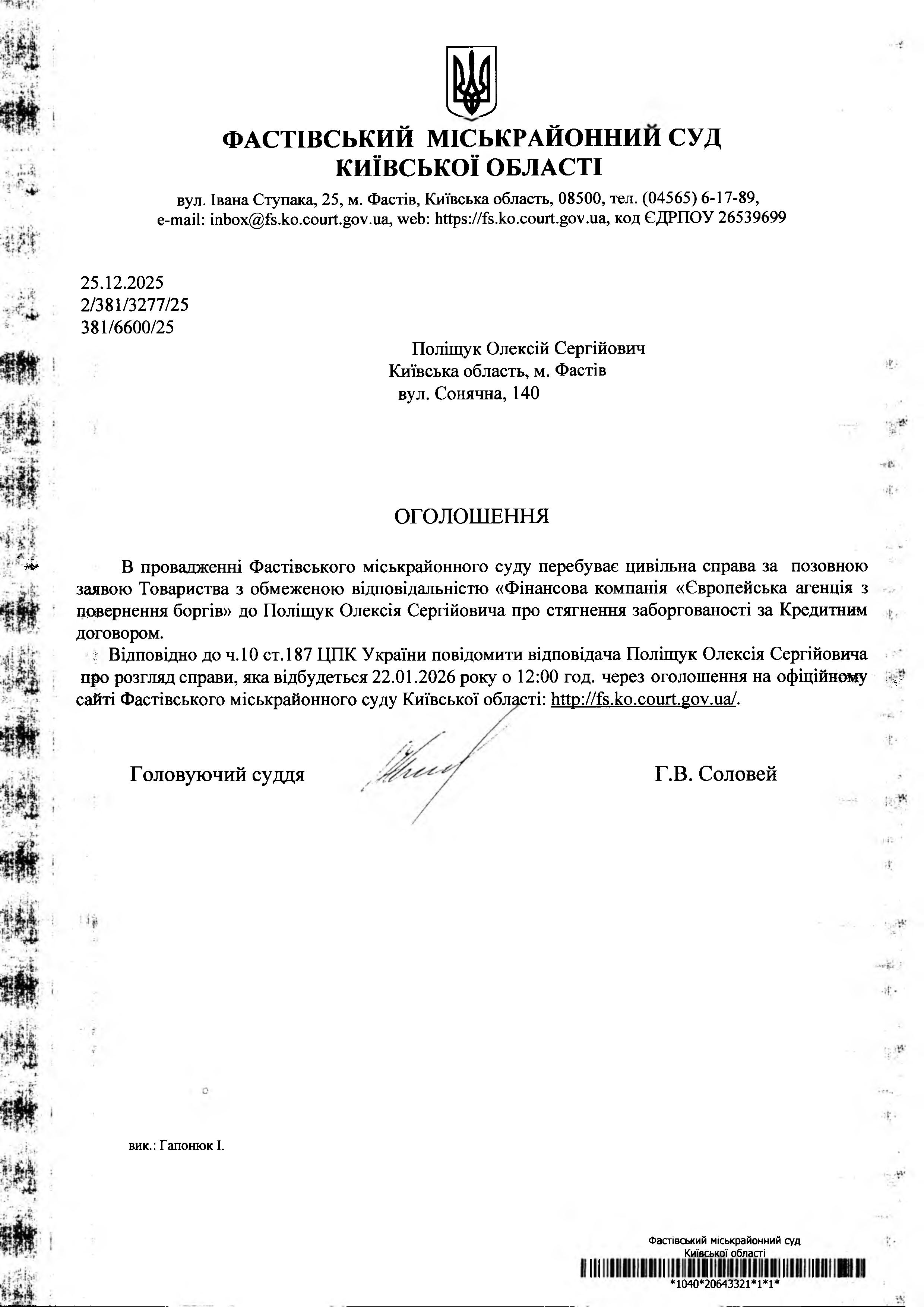 Поліщук Олексій Сергійович Київська область, м. Фастів вул. Сонячна, 140