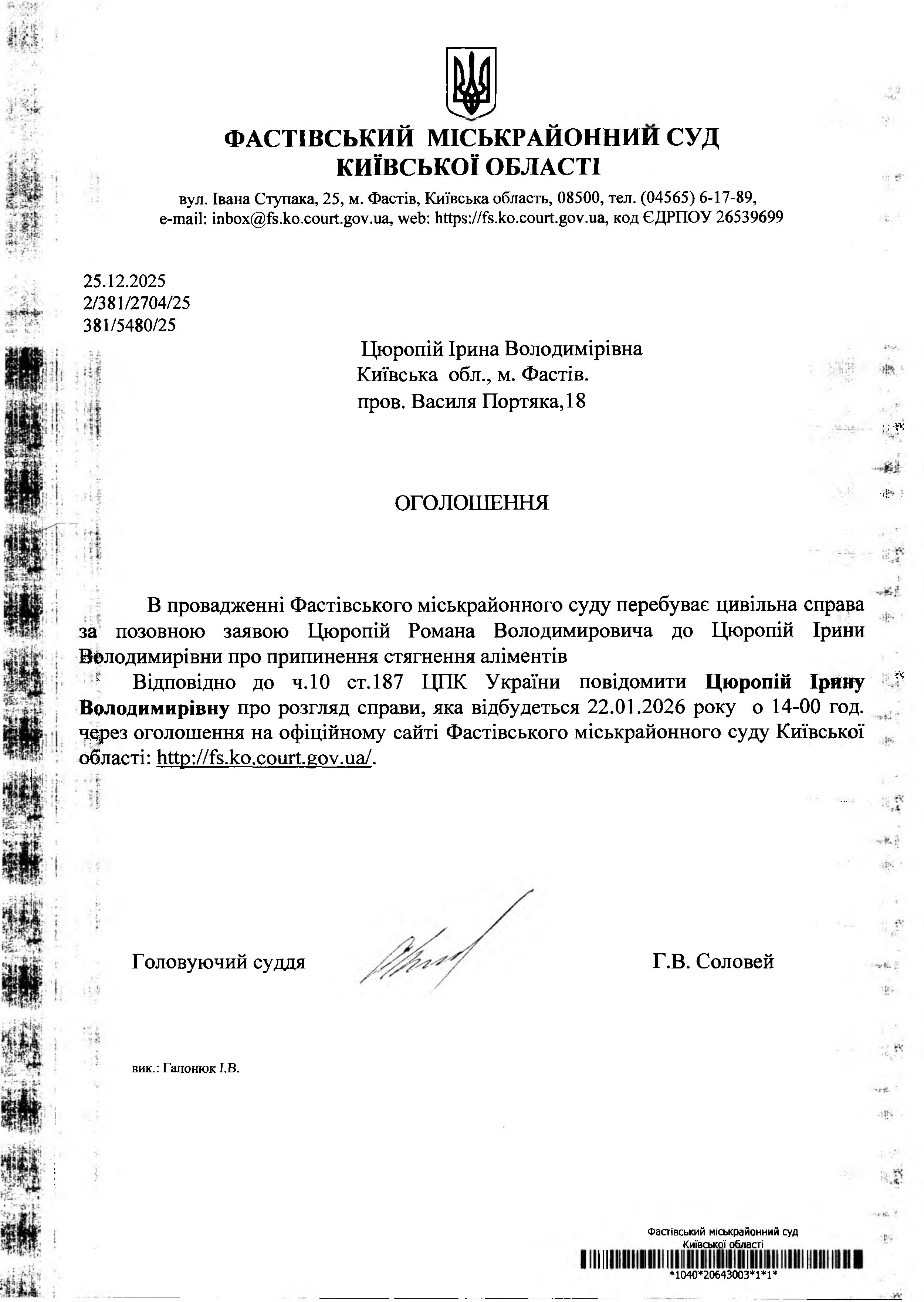 Цюропій Ірина Володимірівна Київська обл., м. Фастів, пров. Василя Портяка, 18