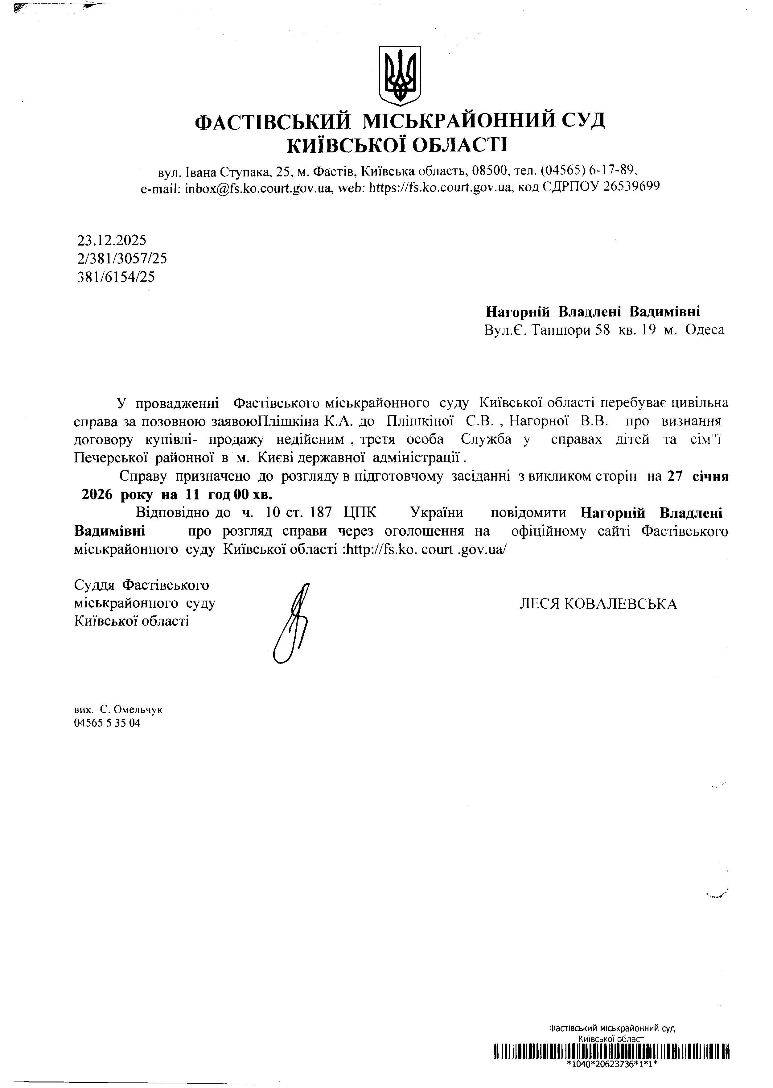 Нагорній Владлені Вадимівні Вул.Є. Танцюри 58 кв. 19 м. Одеса