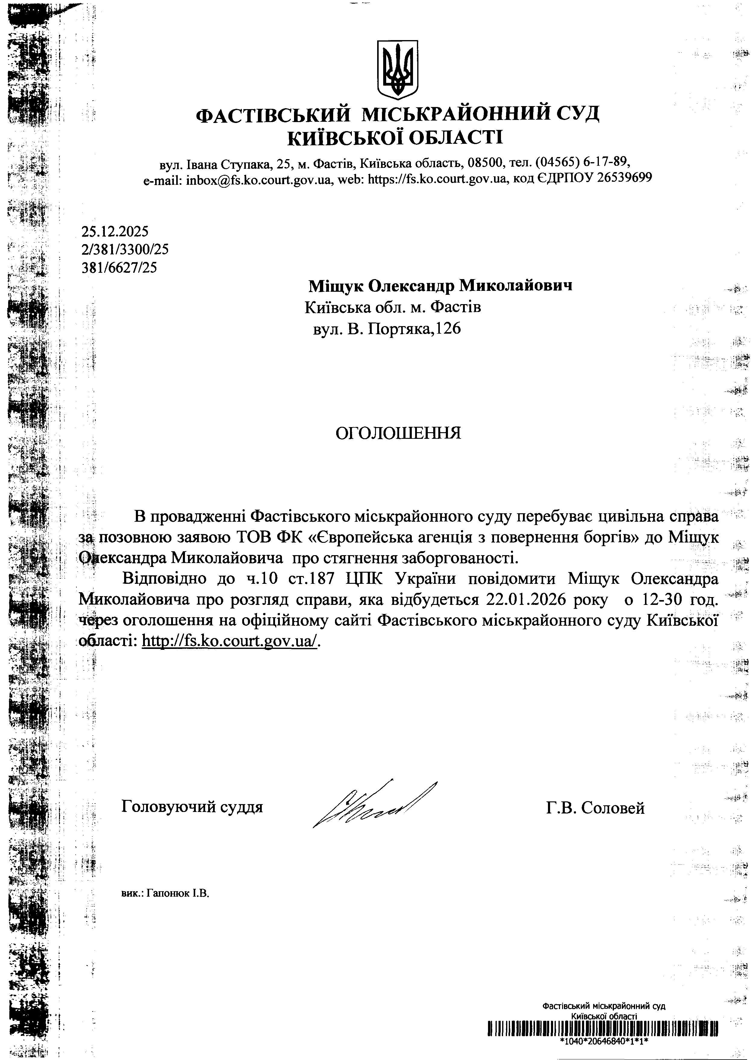 Міщук Олександр Миколайович Київська обл. м. Фастів вул. В. Портяка,126