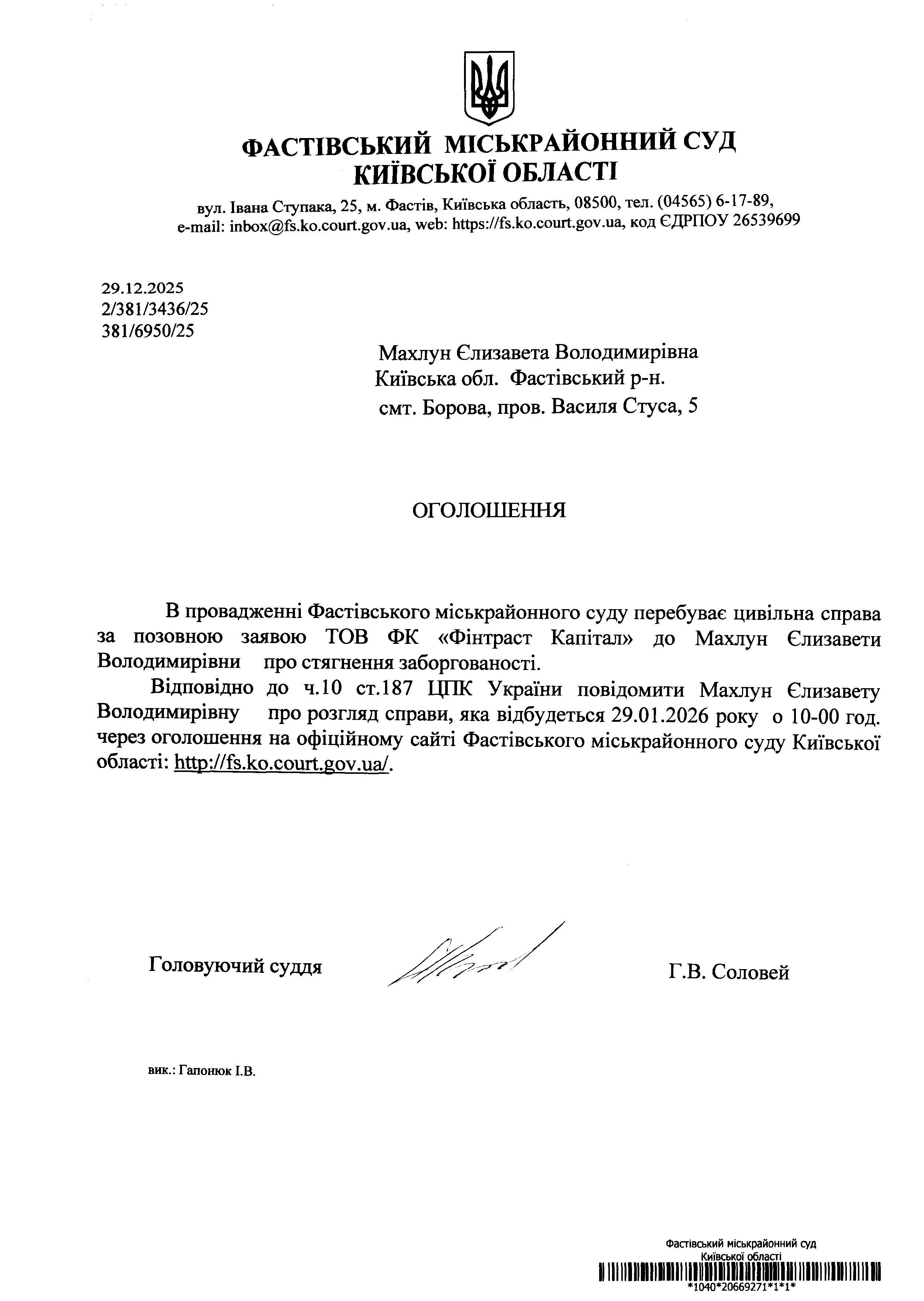 Махлун Єлизавета Володимирівна Київська обл. Фастівський р-н. смт. Борова, пров. Василя Стуса, 5