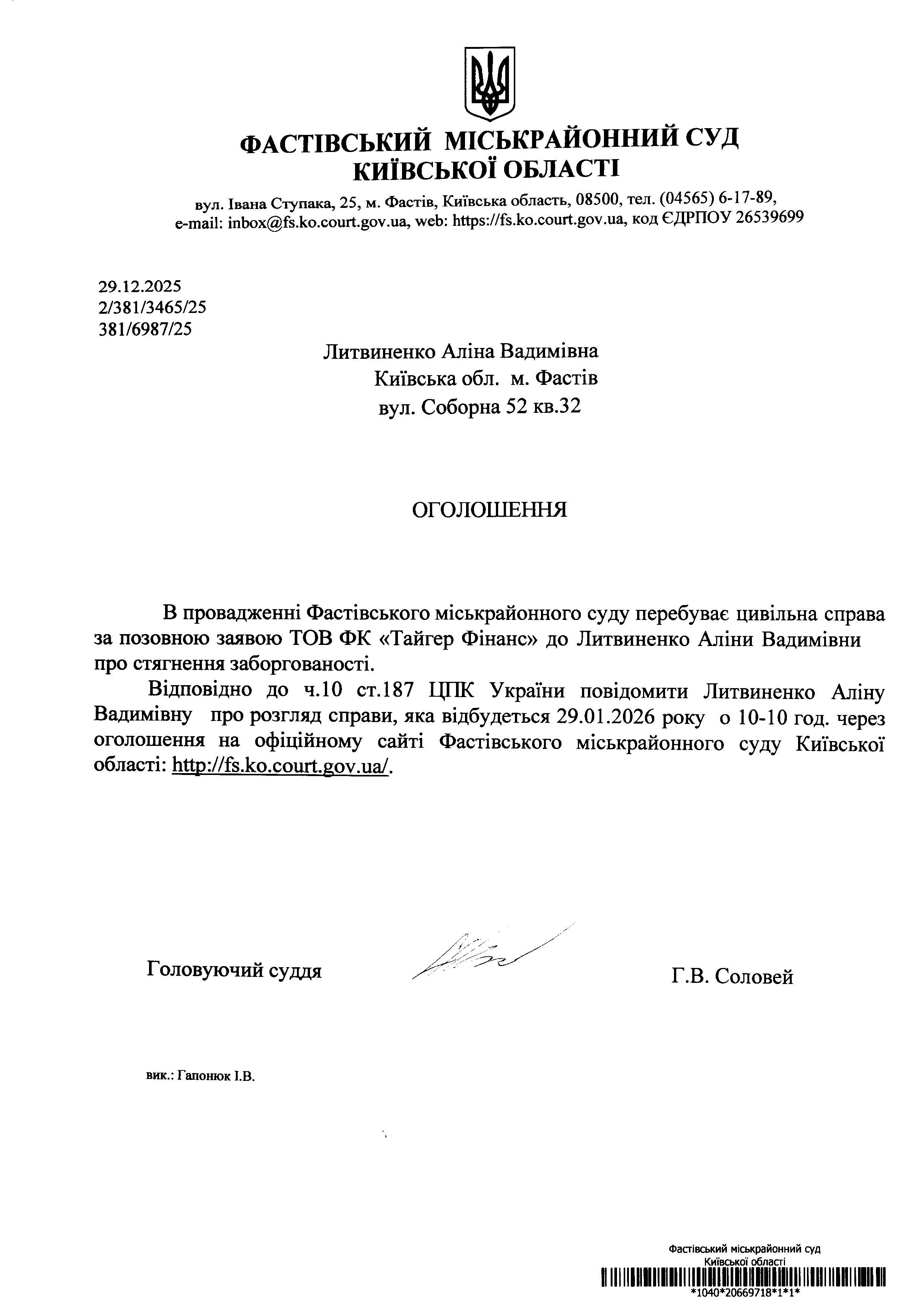 Литвиненко Аліна Вадимівна Київська обл. м. Фастів вул. Соборна 52 кв.32