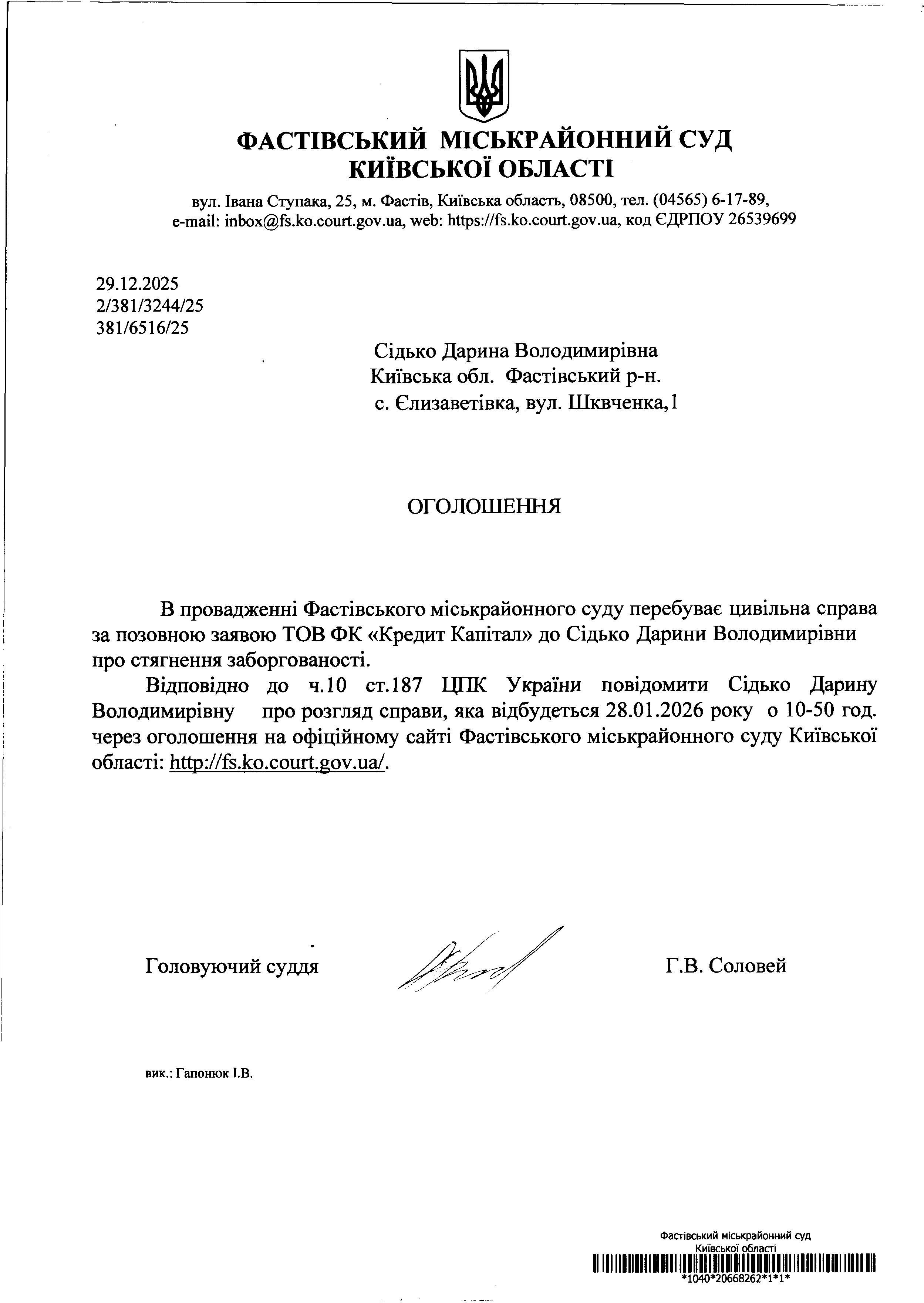 Сідько Дарина Володимирівна Київська обл. Фастівський р-н. с. Єлизаветівка, вул. Шквченка, 1