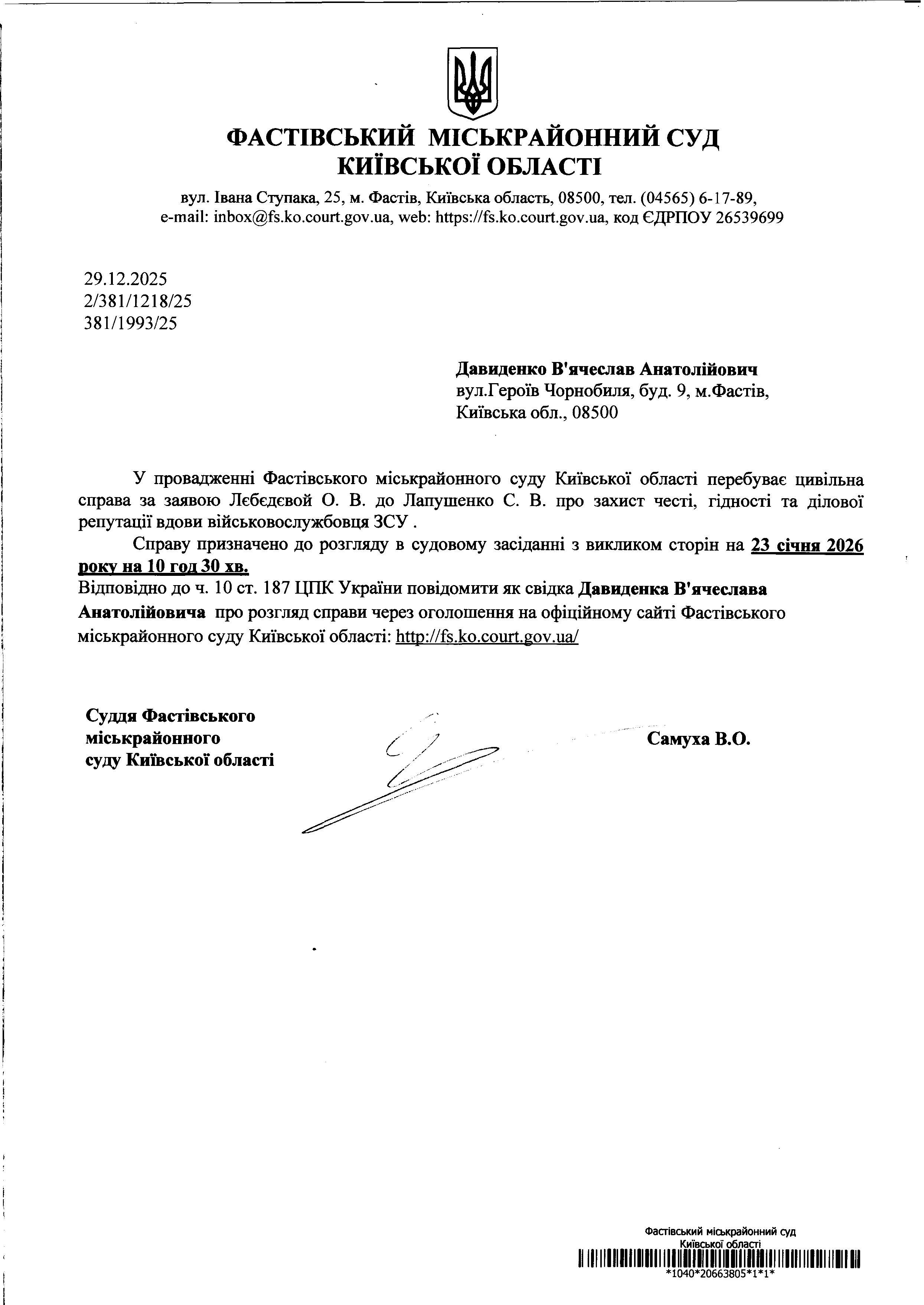 Давиденко В'ячеслав Анатолійович вул.Героїв Чорнобиля, буд. 9, м.Фастів, Київська обл., 08500