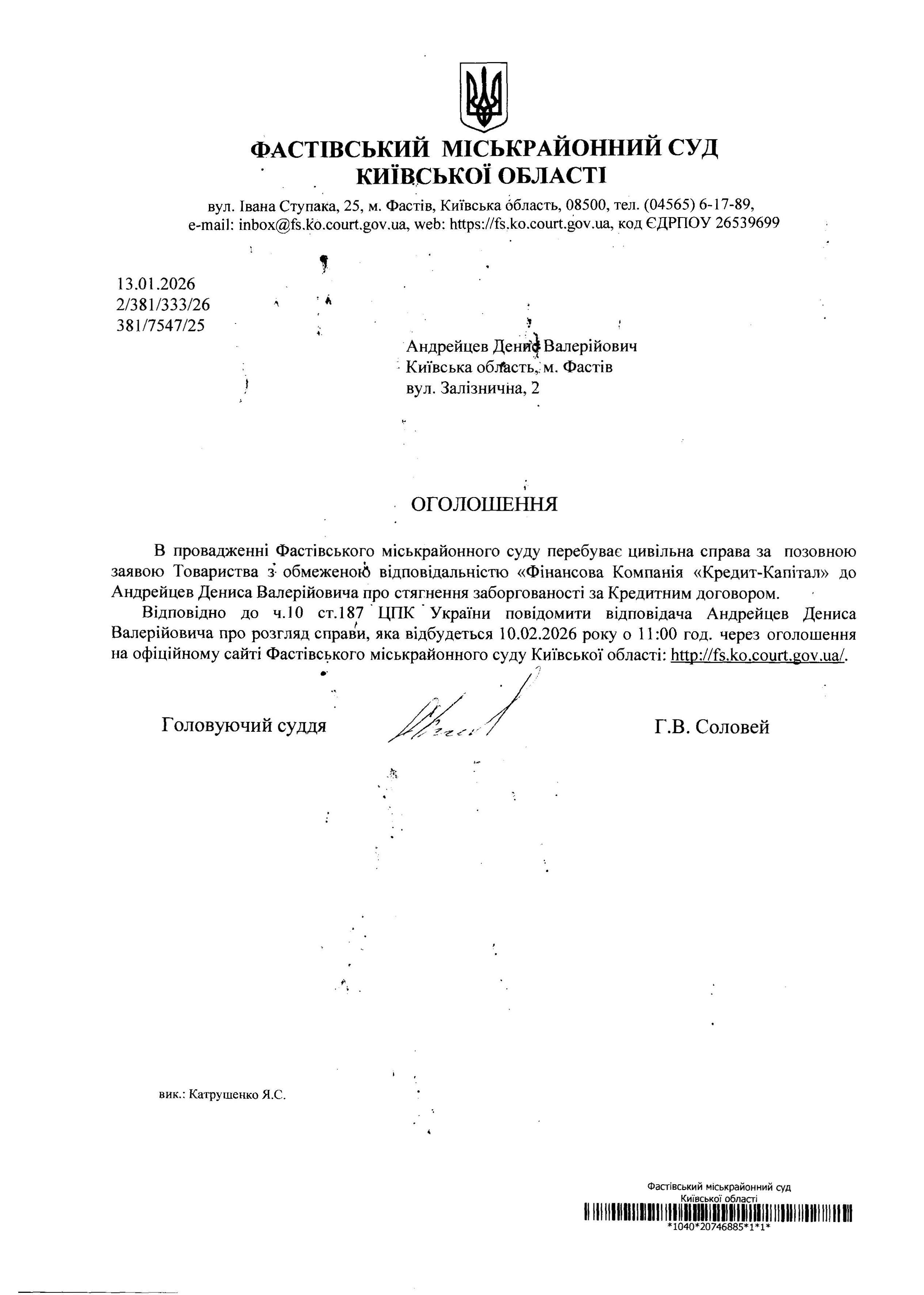 Андрейцев Дени^ Валерійович Київська oo.facTb, M. Фастів вул. Залізнична, 2