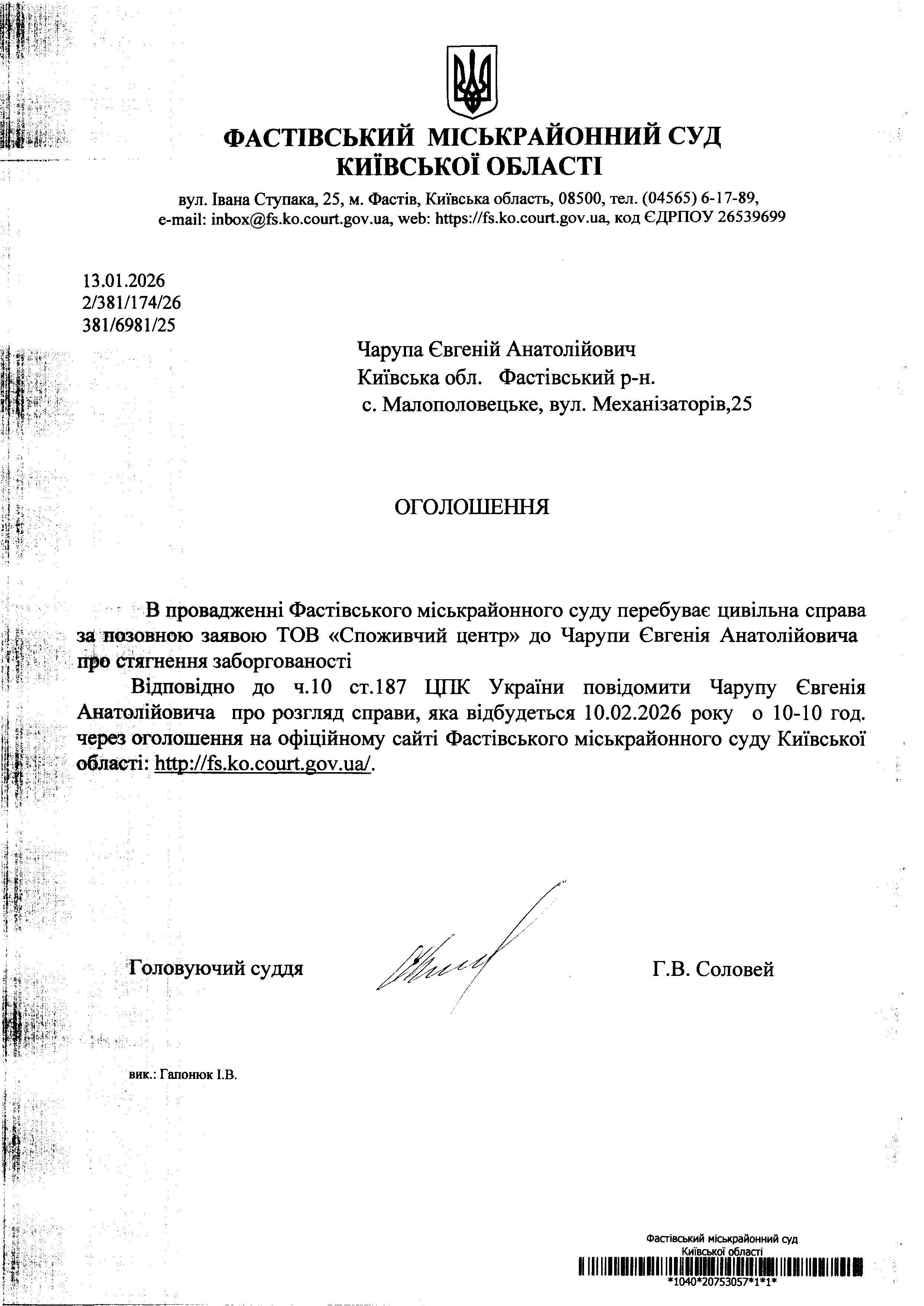 Чарупа Євгеній Анатолійович Київська обл. Фастівський р-н. с. Малополовецьке, вул. Механізаторів,25