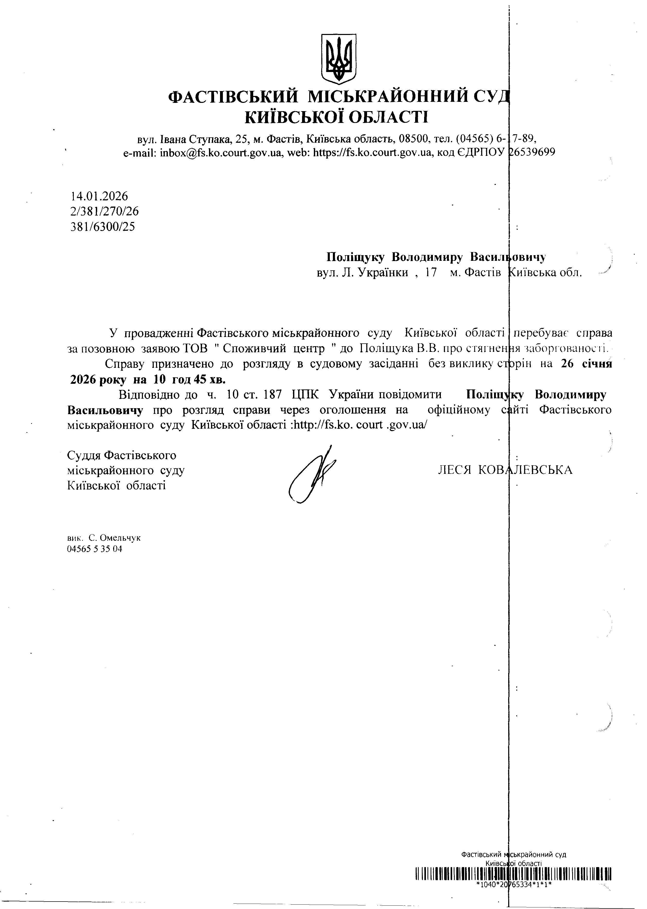 Поліщуку Володимиру Васильовичу вул. Л. Українки , 17 м. Фастів київська обл.