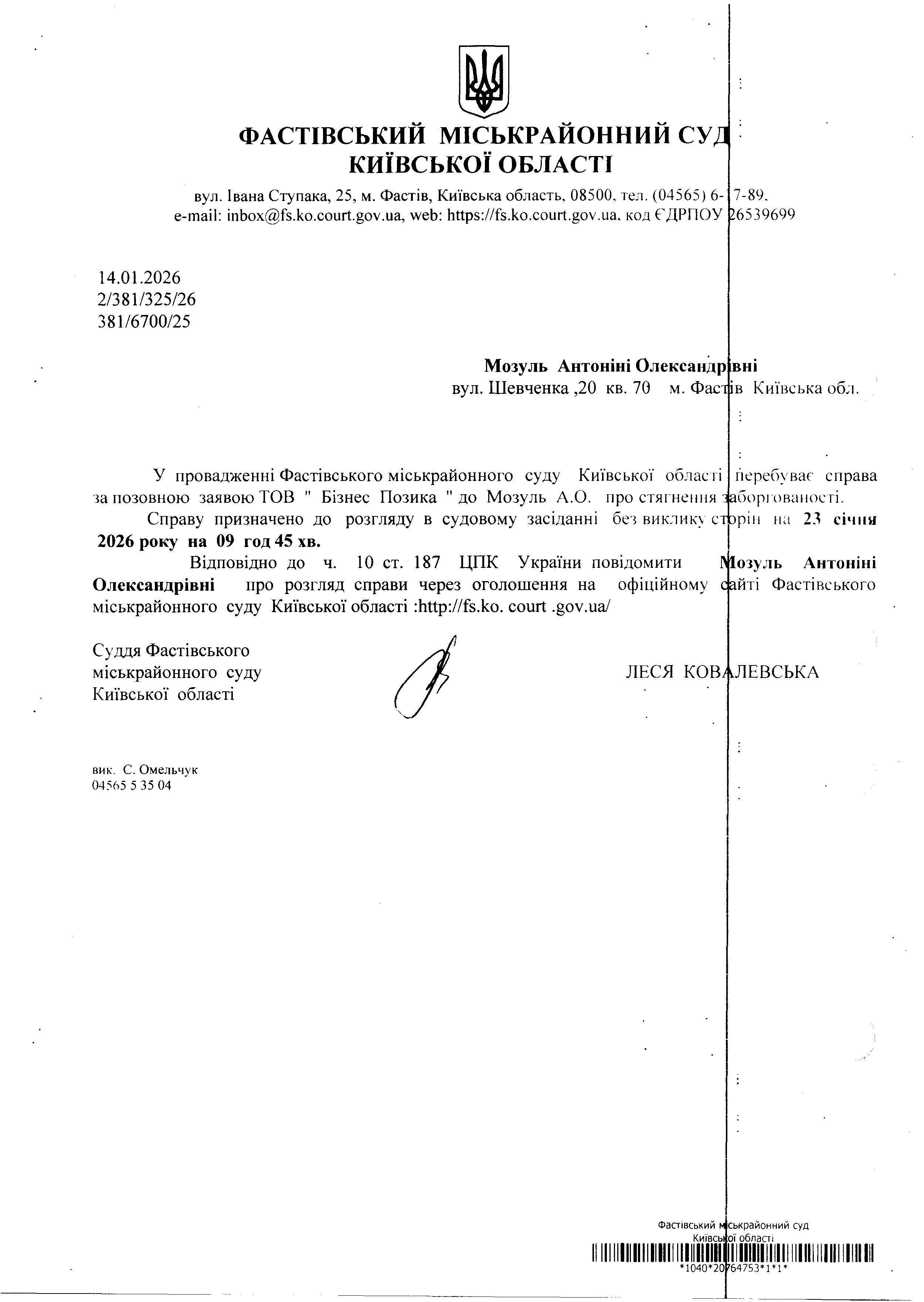 Мозуль Антоніні Олександр.; вул. Шевченка ,20 кв. 70 м. Фастр