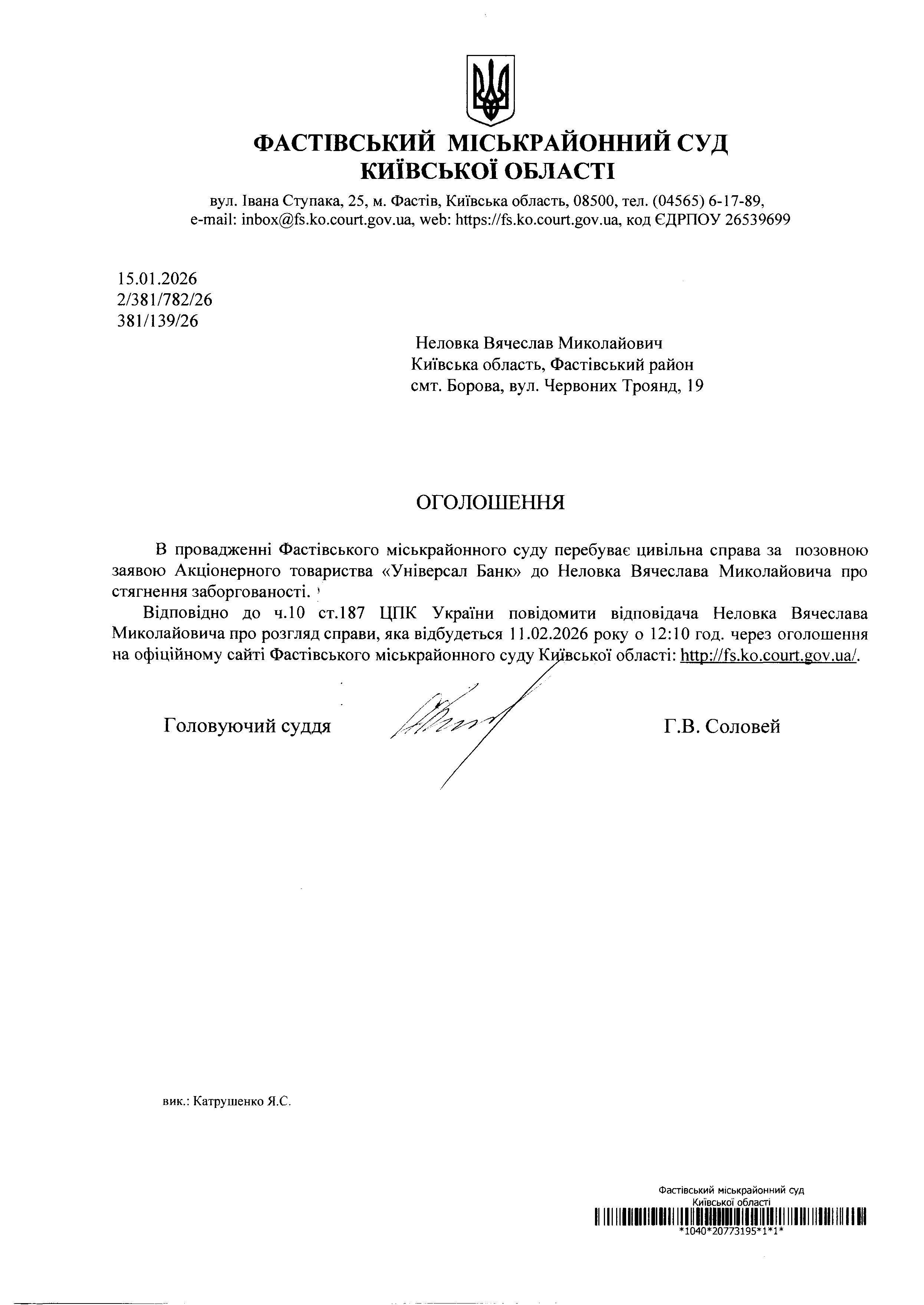 Неловка Вячеслав Миколайович Київська область, Фастівський район смт. Борова, вул. Червоних Троянд, 19