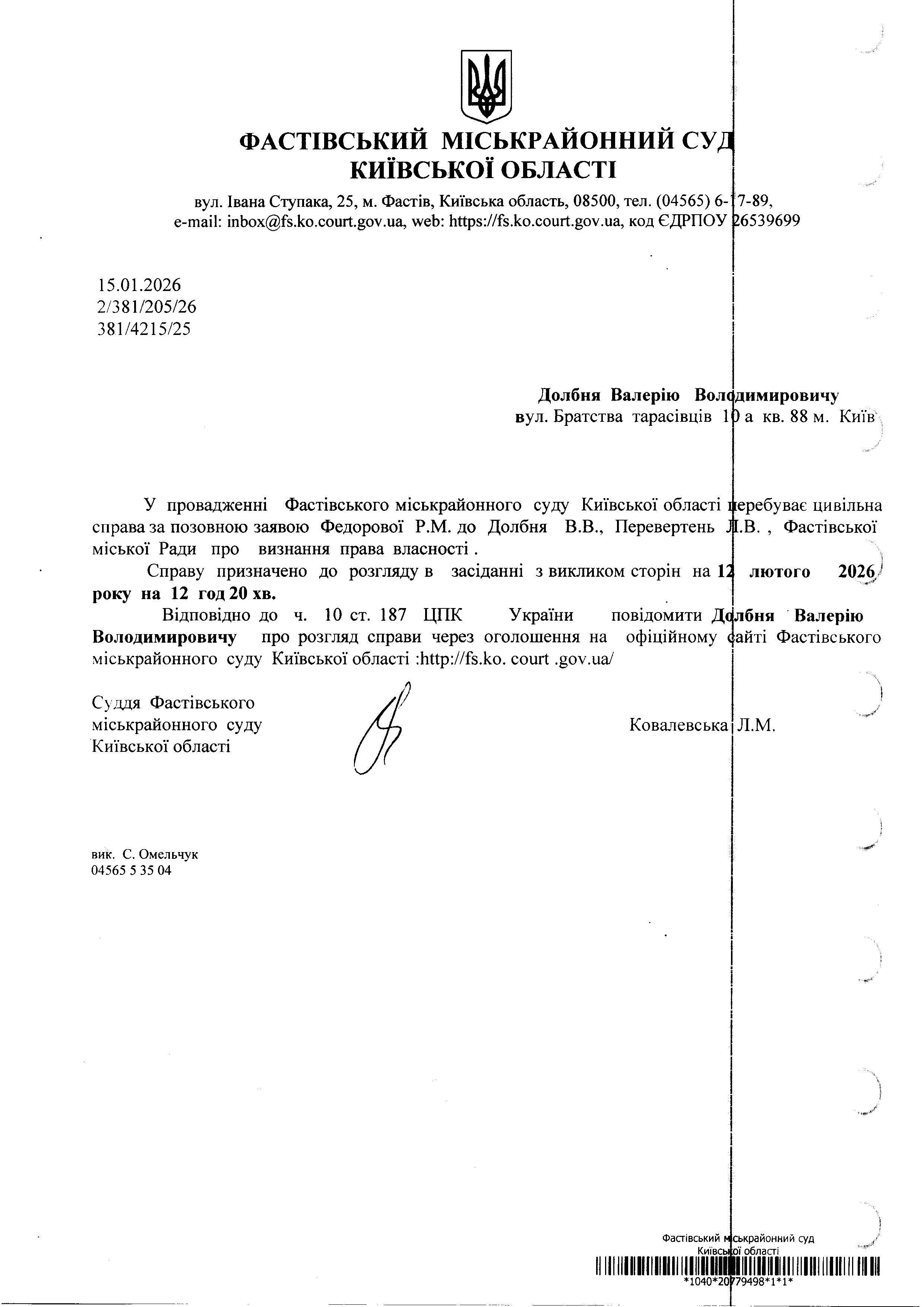 Долбня Валерію Волф вул. Братства тарасівців 10а димировичу а кв. 88 м. Київ перебуває цивільна В. , Фастівської