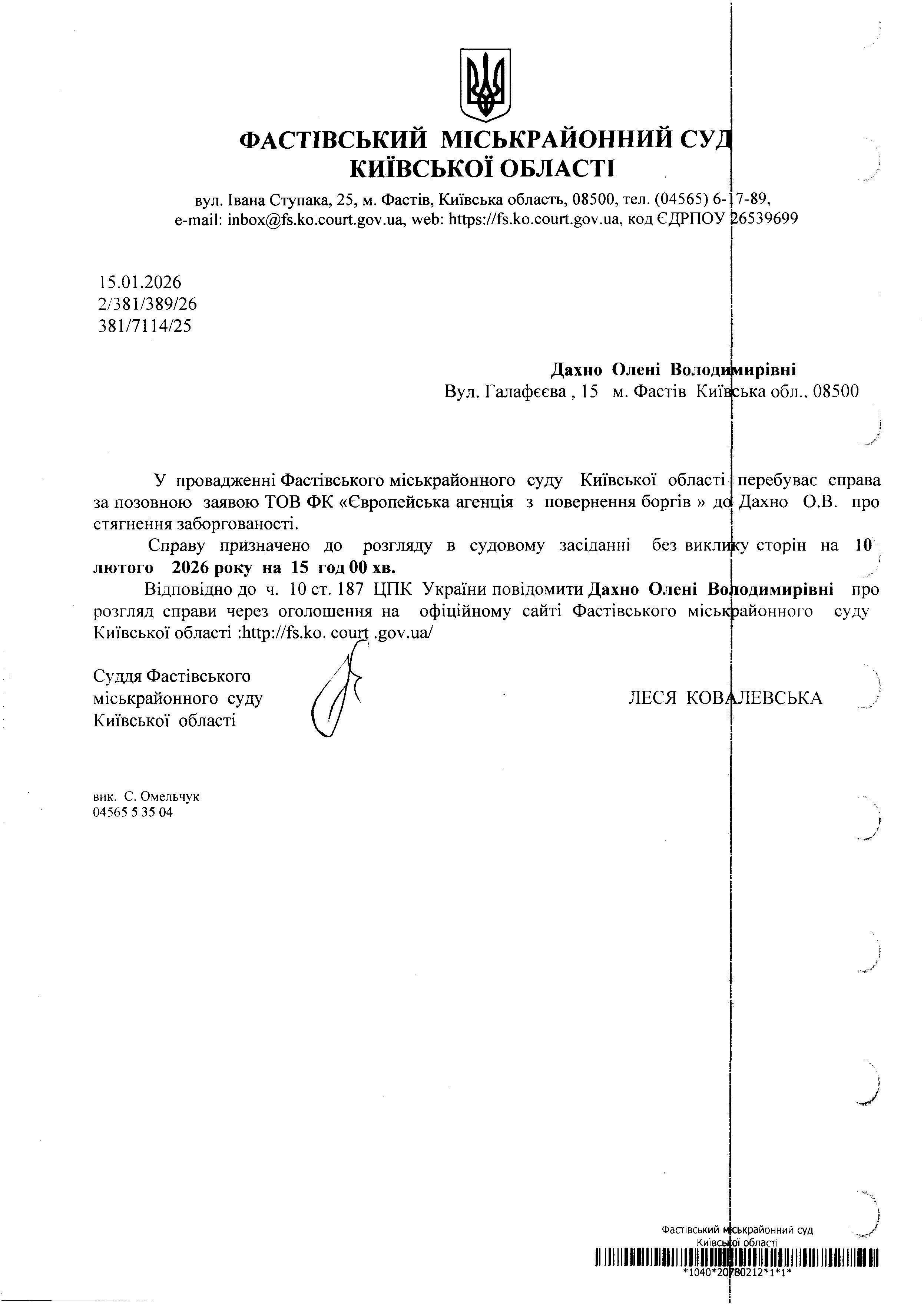 Дахно Олені Володі Вул. Галафєєва, 15 м. Фастів Київіс