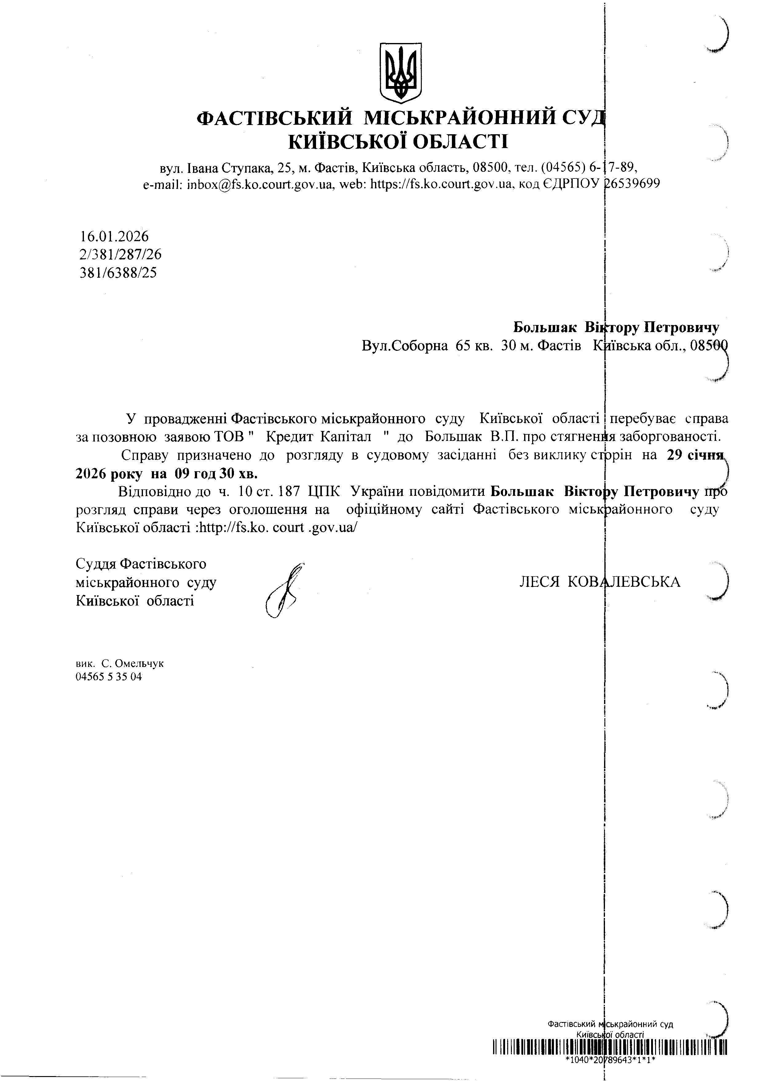 Большак Віктору Петровичу обл., 08500 Вул.Соборна 65 кв. ЗО м. Фастів