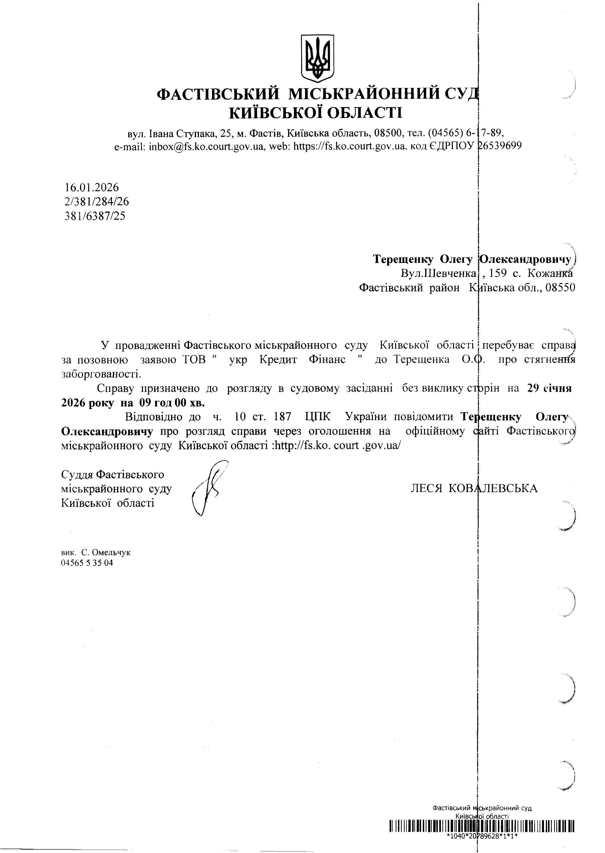 Терещенку Олегу Олександровичу Вул.Шевченка Фастівський район Вул.Шевченка Фастівський район ,159 с. Кожанка Київська обл., 08550