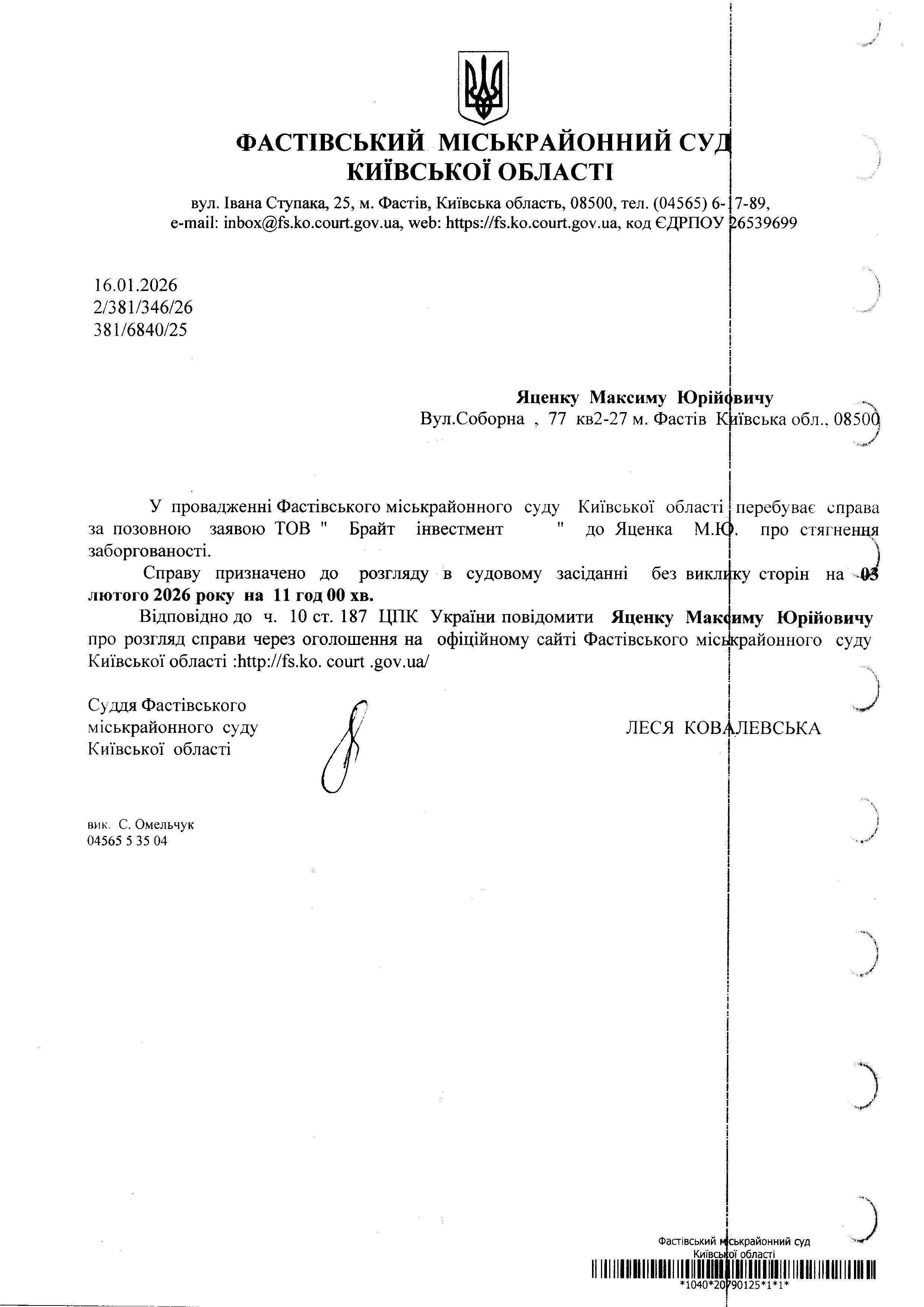 Яценку Максиму Юрійовичу Вул.Соборна , 77 кв2-27 м. Фастів Київська обл