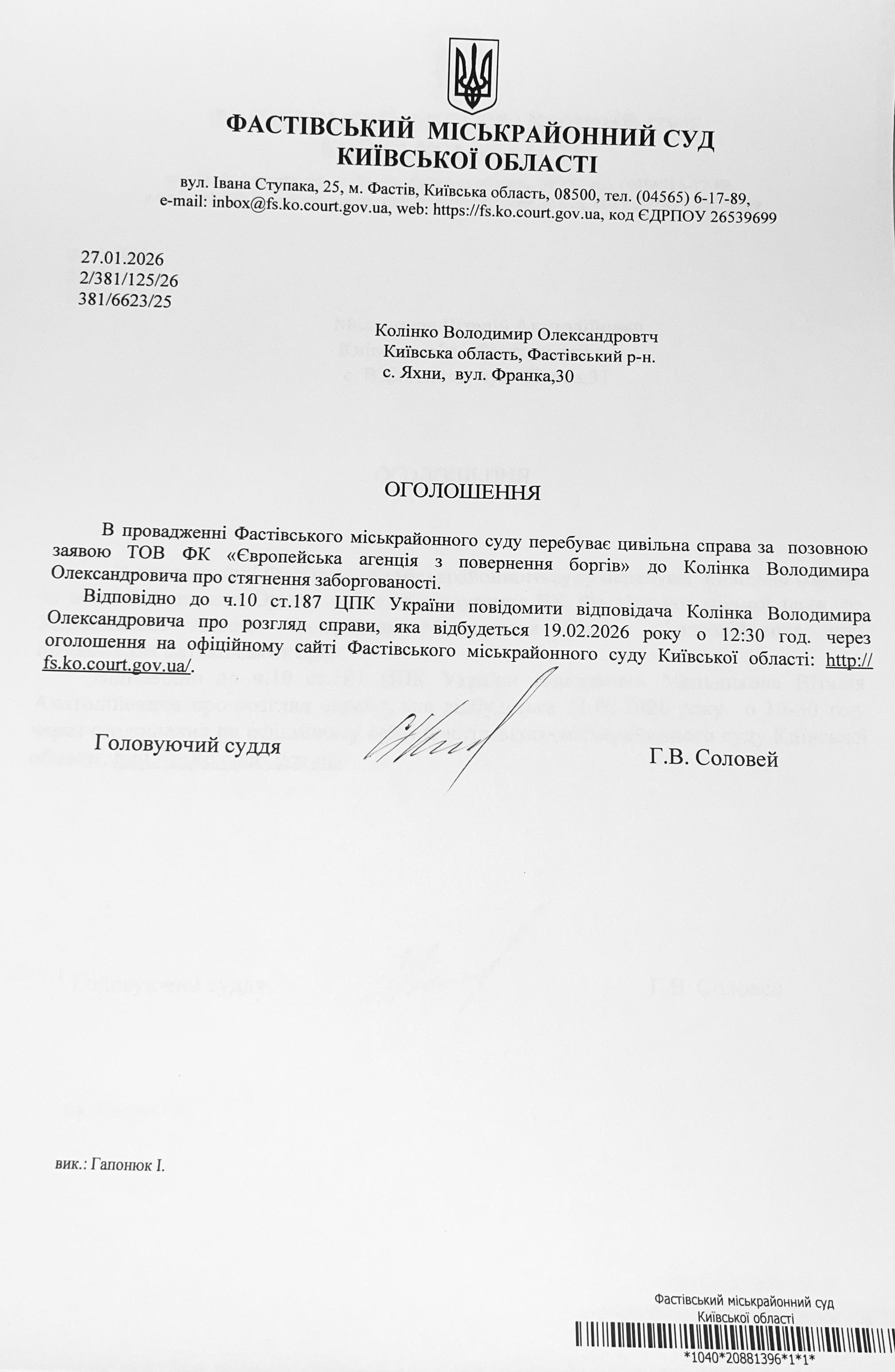 Фастівський міськрайонний суд Київської області повідомляє Колінка Володимира Олександровича про розгляд справи, який відбудеться 19.02. 2026 року о 12 год 30 хв
