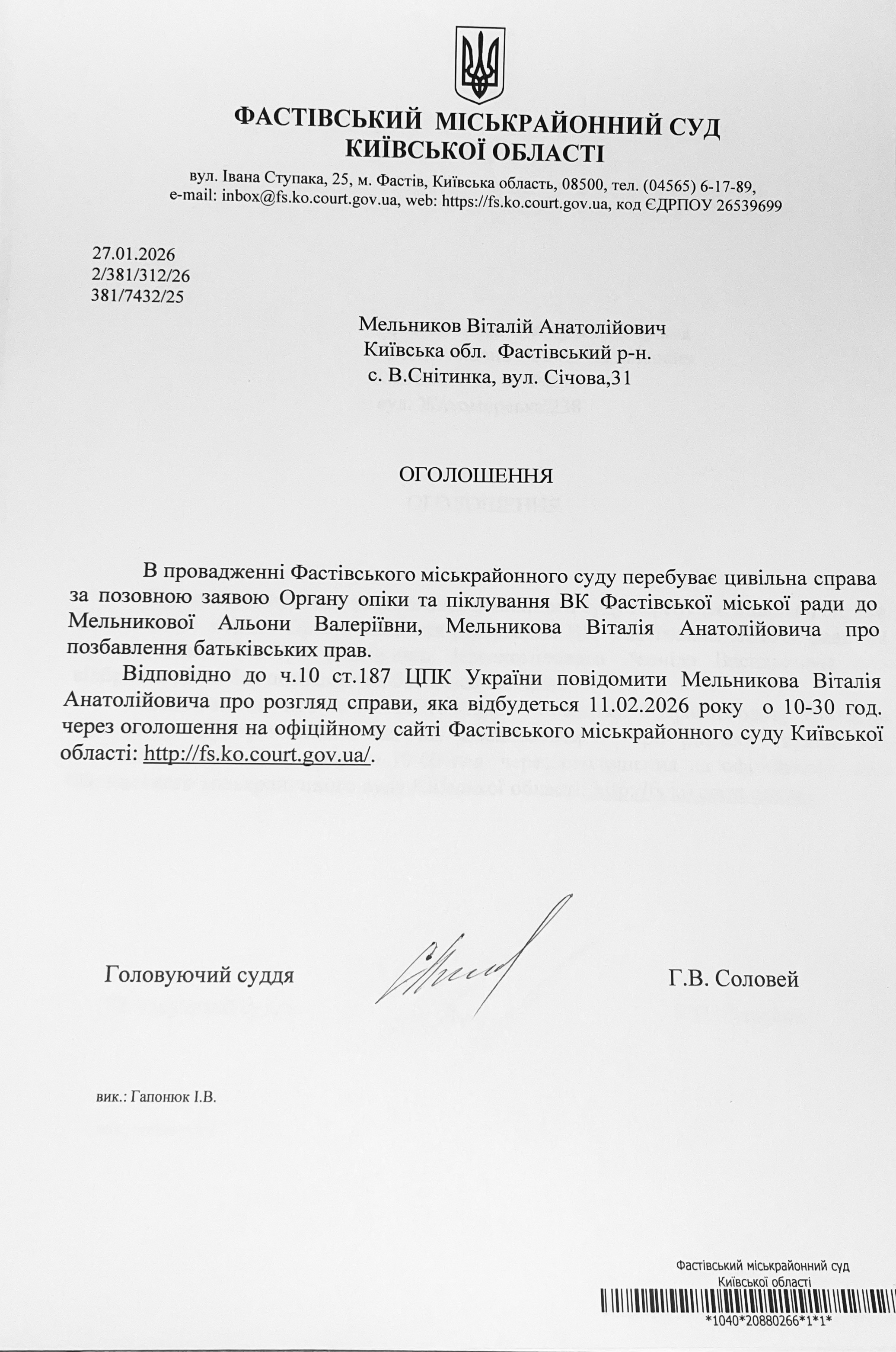Фастівський міськрайонний суд Київської області повідомляє Мельникова Віталія Анатолійовича про розгляд справи, який відбудеться 11.02.2026 року о 10 год 30 хв