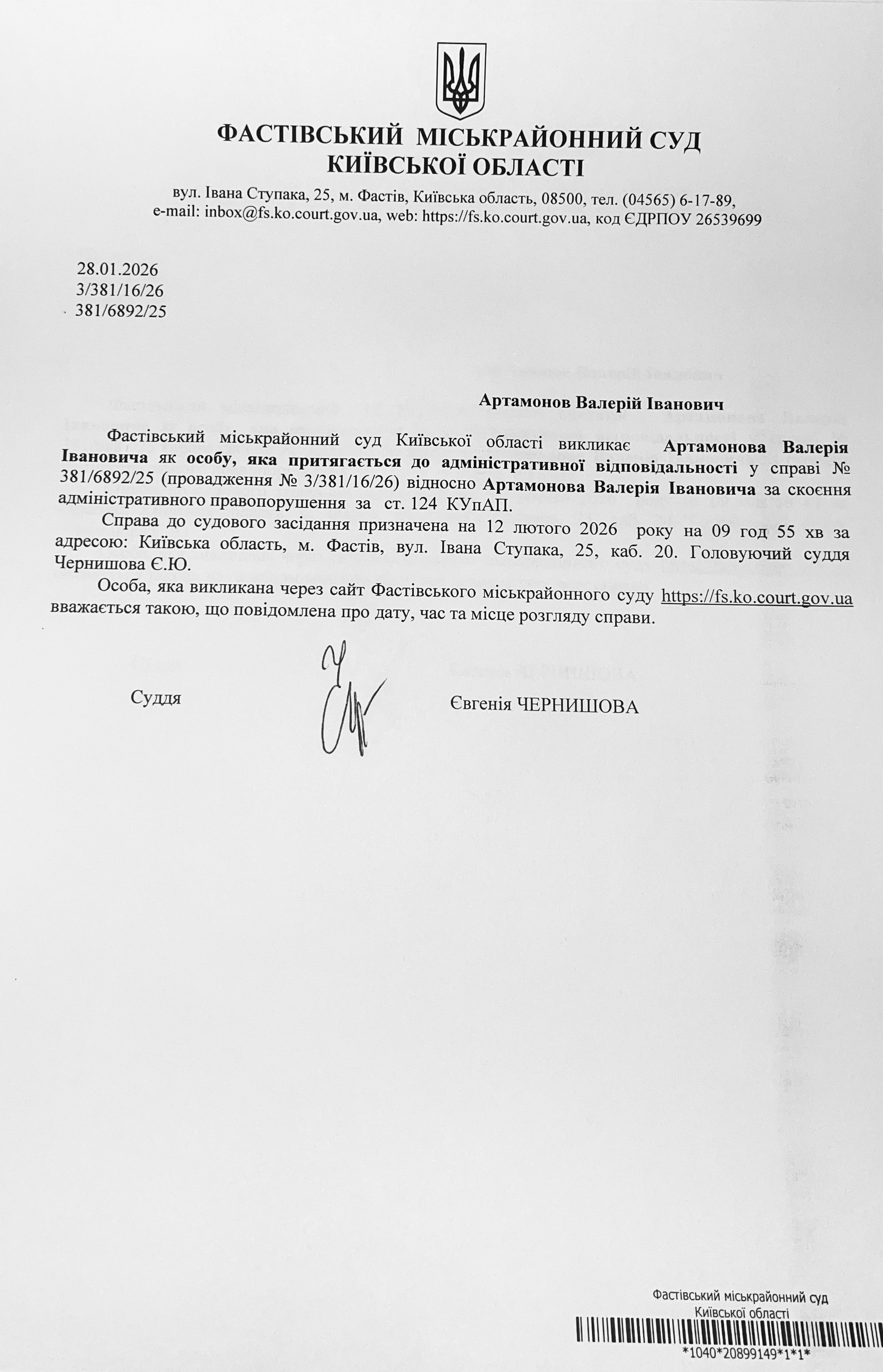 Фастівський міськрайонний суд Київської області викликає Артамонова Валерія Івановича