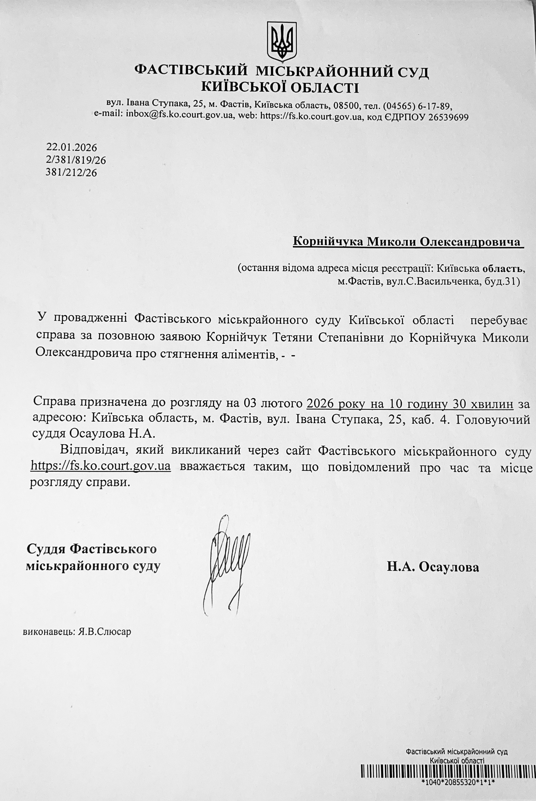 Фастівський міськрайонний суд Київської області викликає Корнійчук Миколу Олександровича