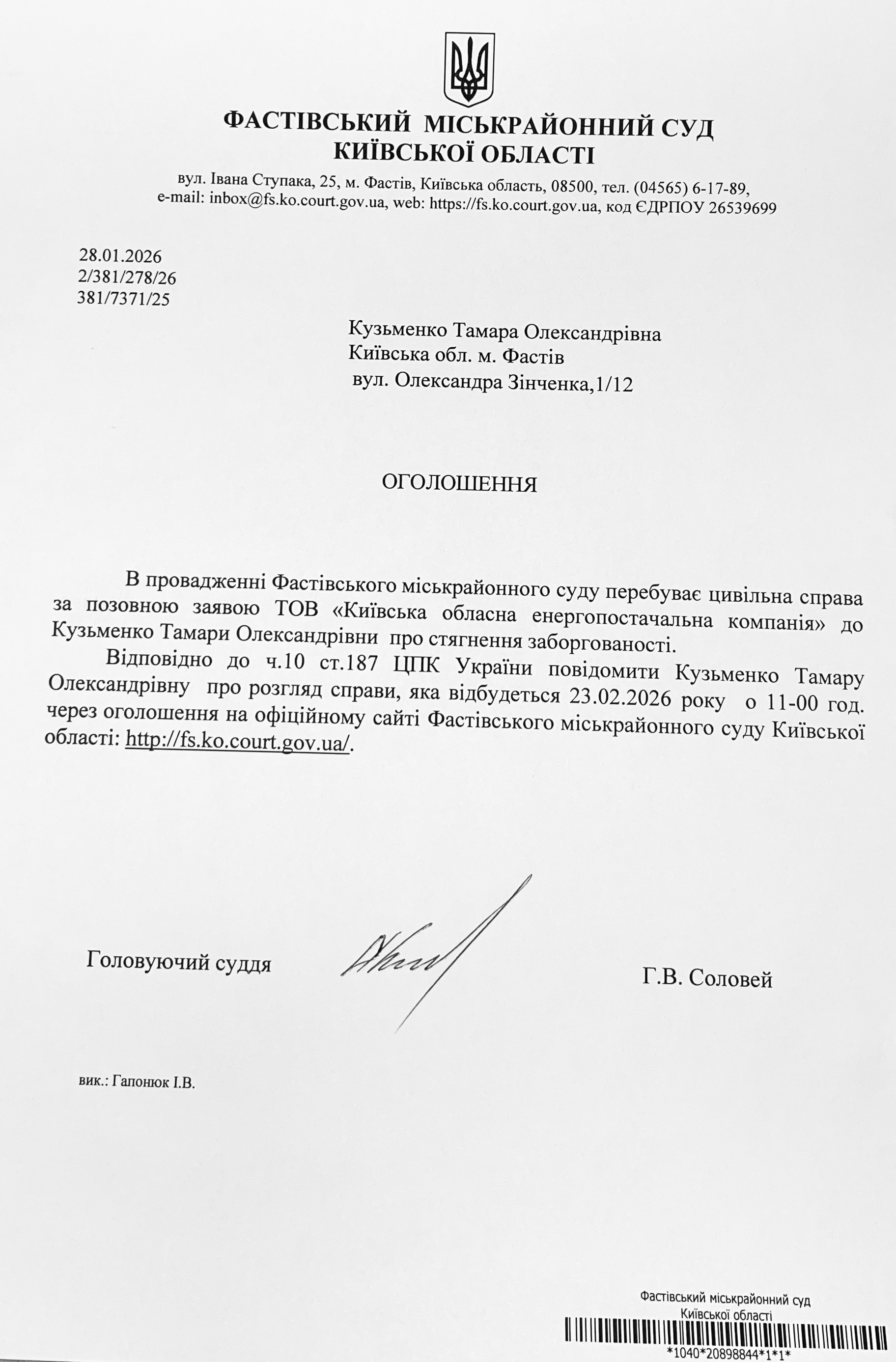 Фастівський міськрайонний суд Київської області викликає Кузьменко Тамару Олександрівну