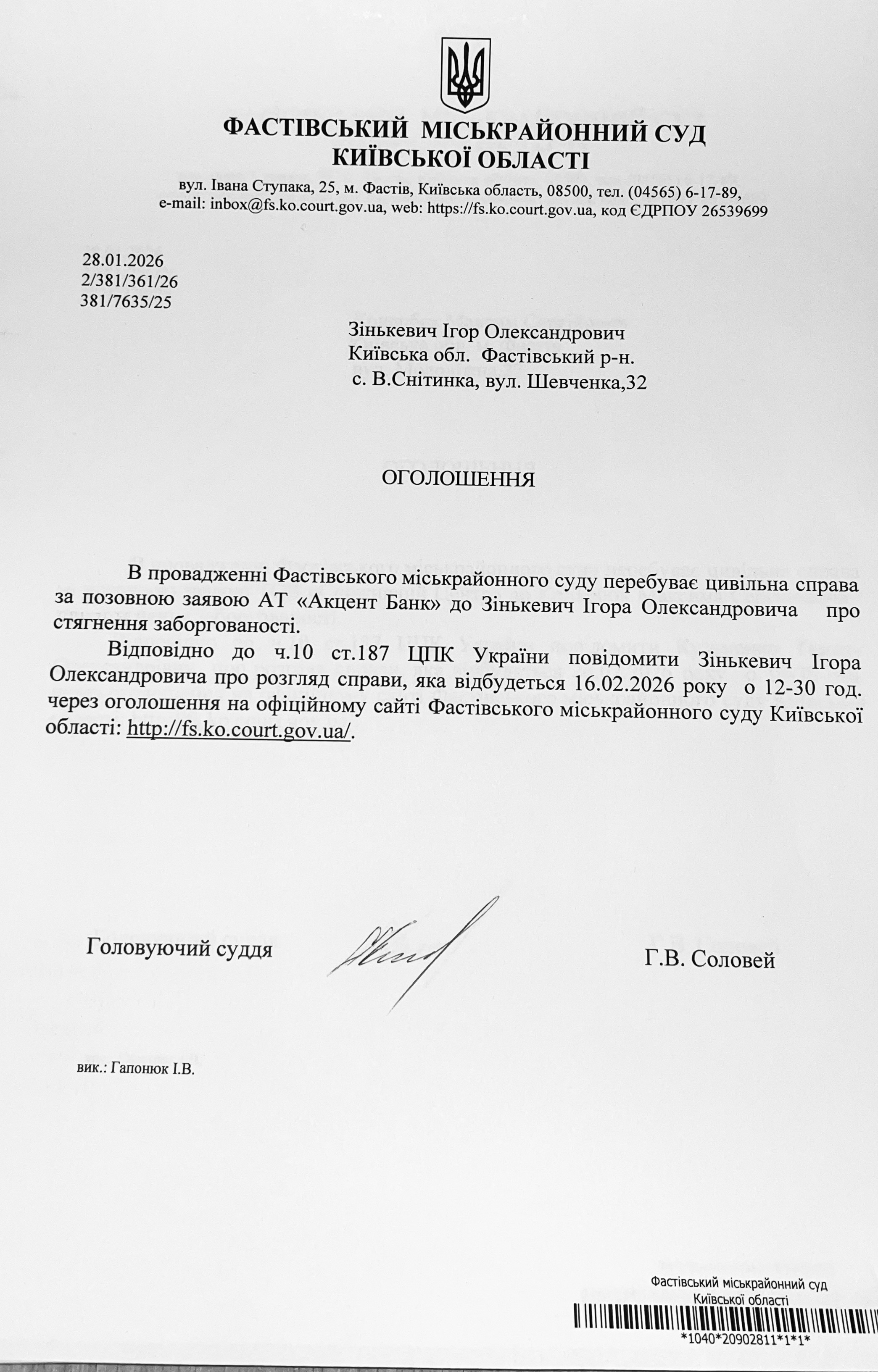Фастівський міськрайонний суд Київської області викликає Зінькевича Ігоря Олександровича