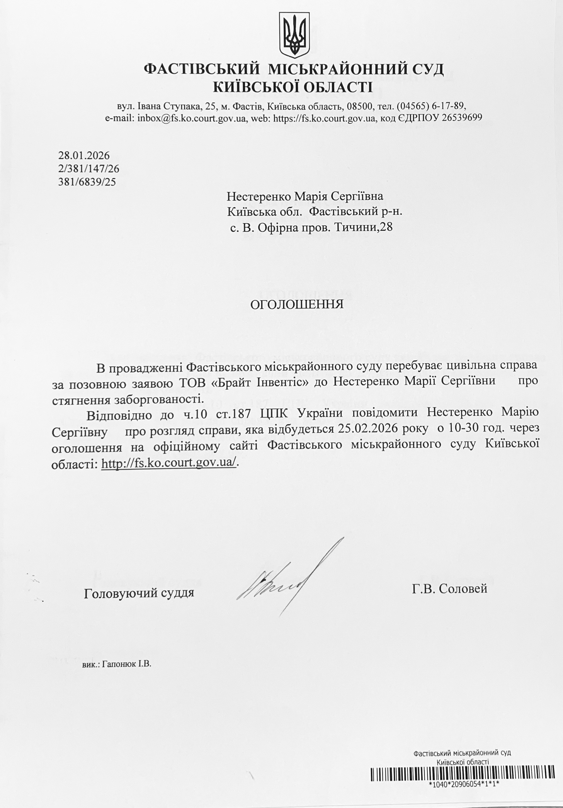 Фастівський міськрайонний суд Київської області викликає Нестеренко Марію Сергіївну