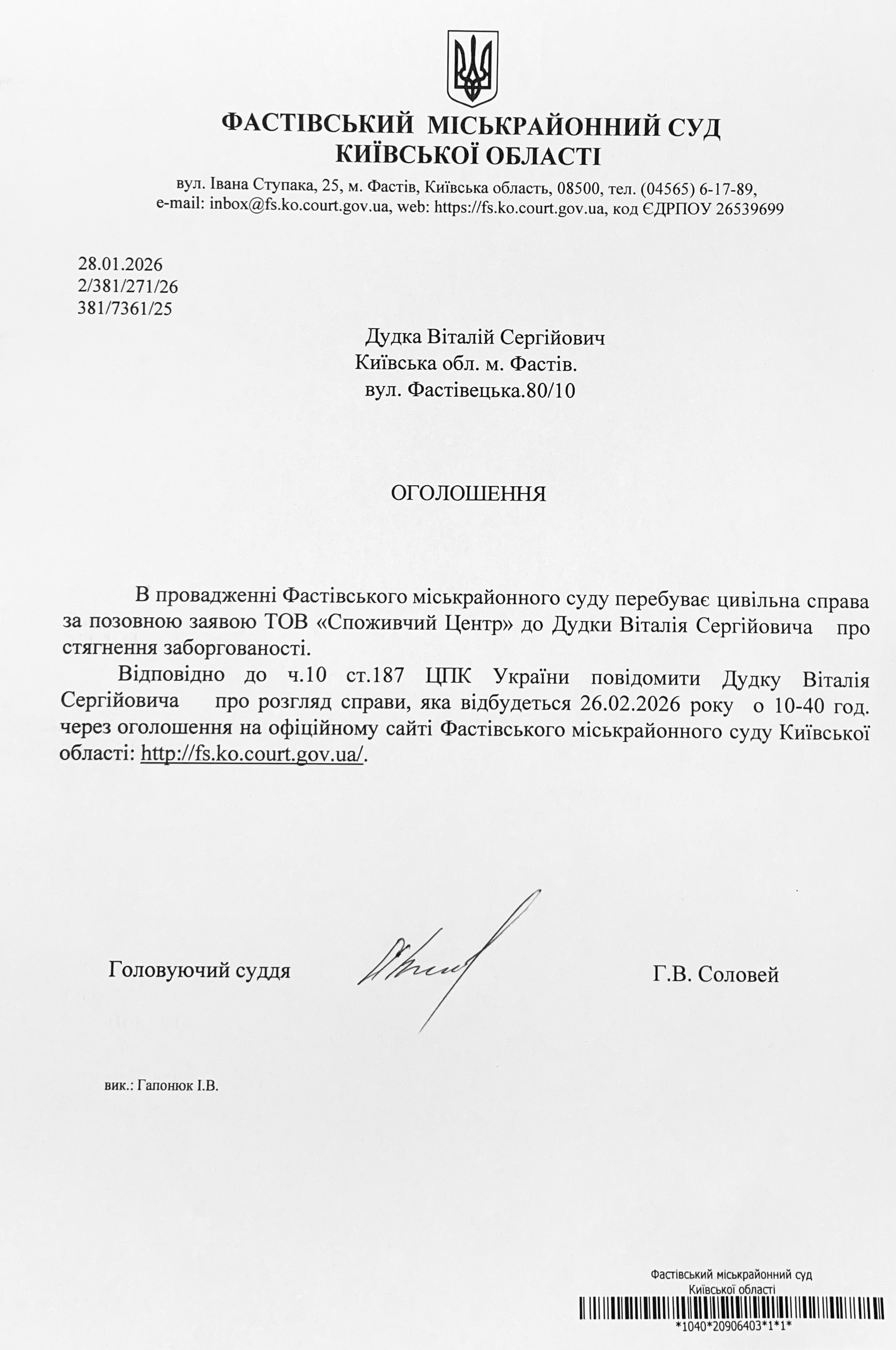 Фастівський міськрайонний суд Київської області викликає Дудку Віталія Сергійовича