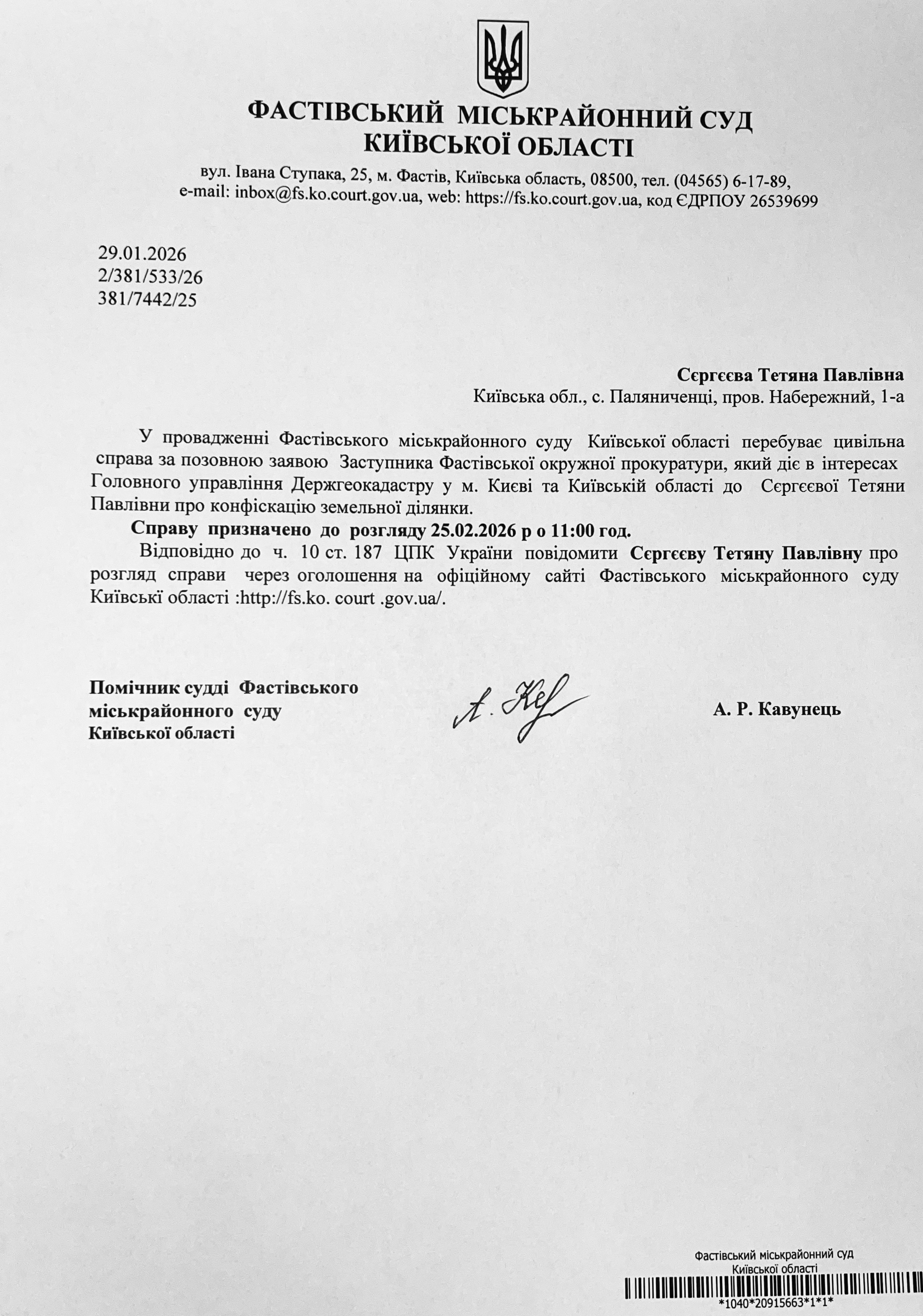 Фастівський міськрайонний суд Київської області викликає Сєргєєву Тетяну Павлівну