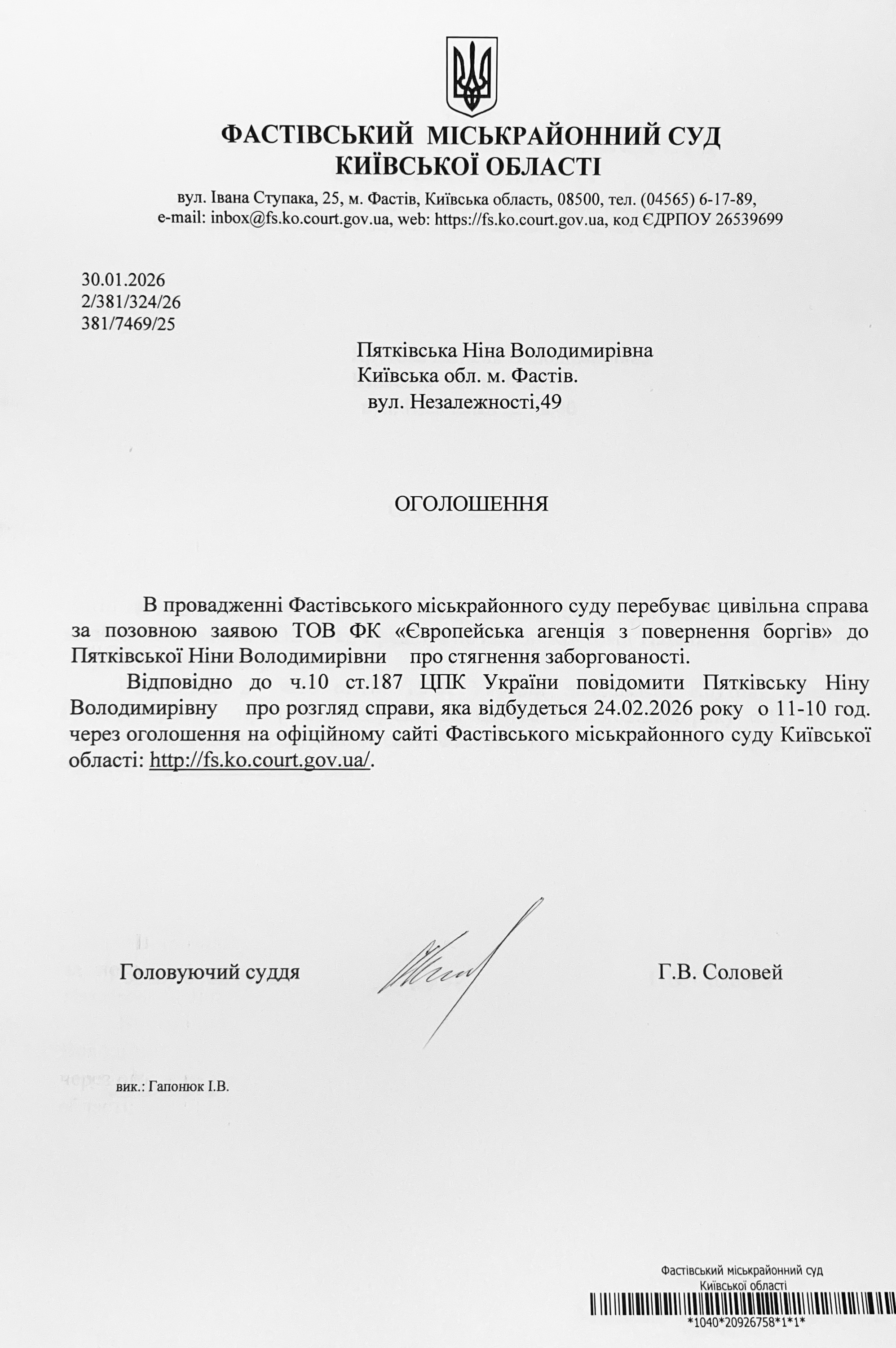 Фастівський міськрайонний суд Київської області викликає Пятківську Ніну Володимирівну