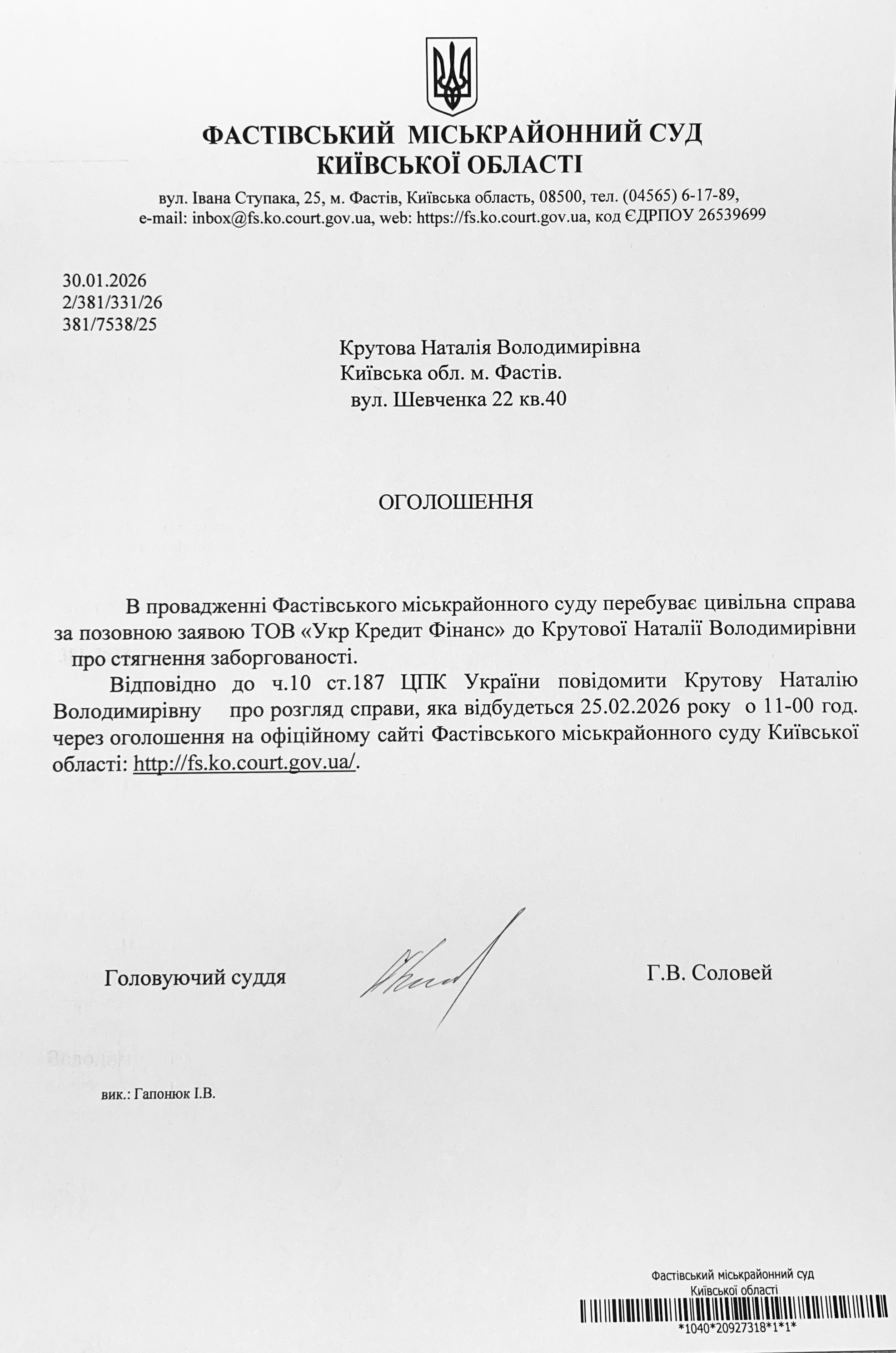 Фастівський міськрайонний суд Київської області викликає Крутову Наталію Володимирівну