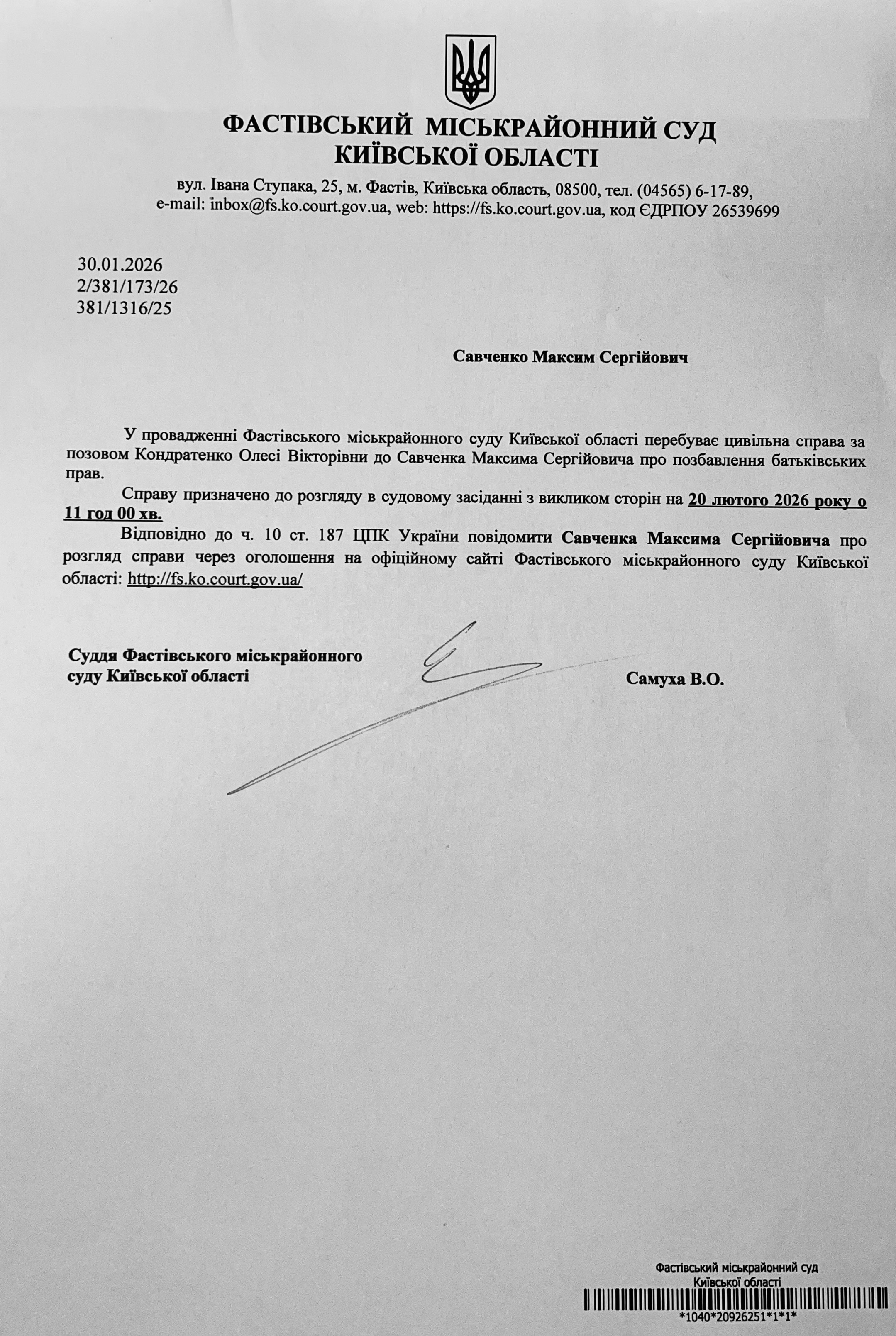 Фастівський міськрайонний суд Київської області викликає Савченка Максима Сергійовича