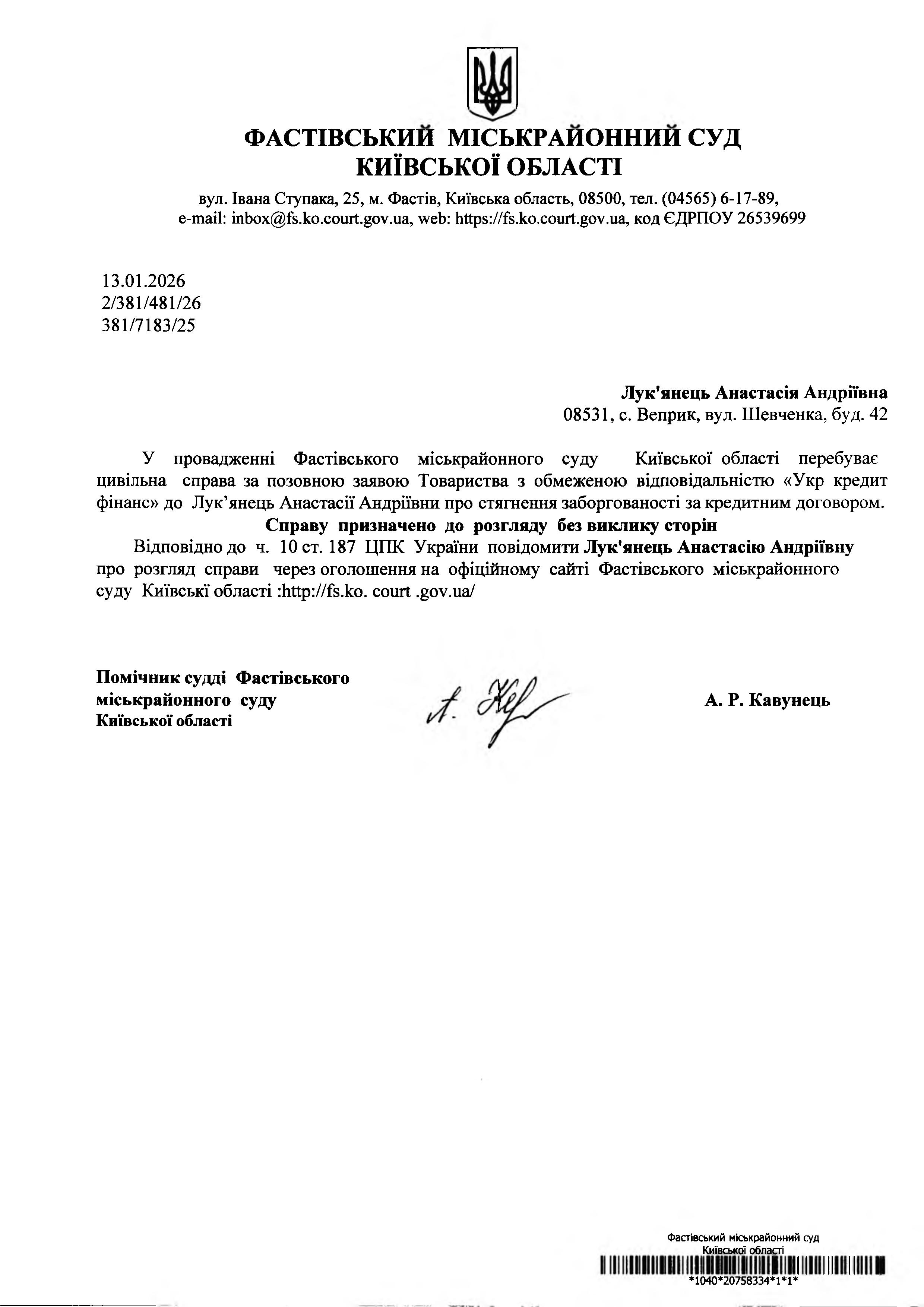 Лук'янець Анастасія Андріївна 08531, с. Веприк, вул. Шевченка, буд. 42