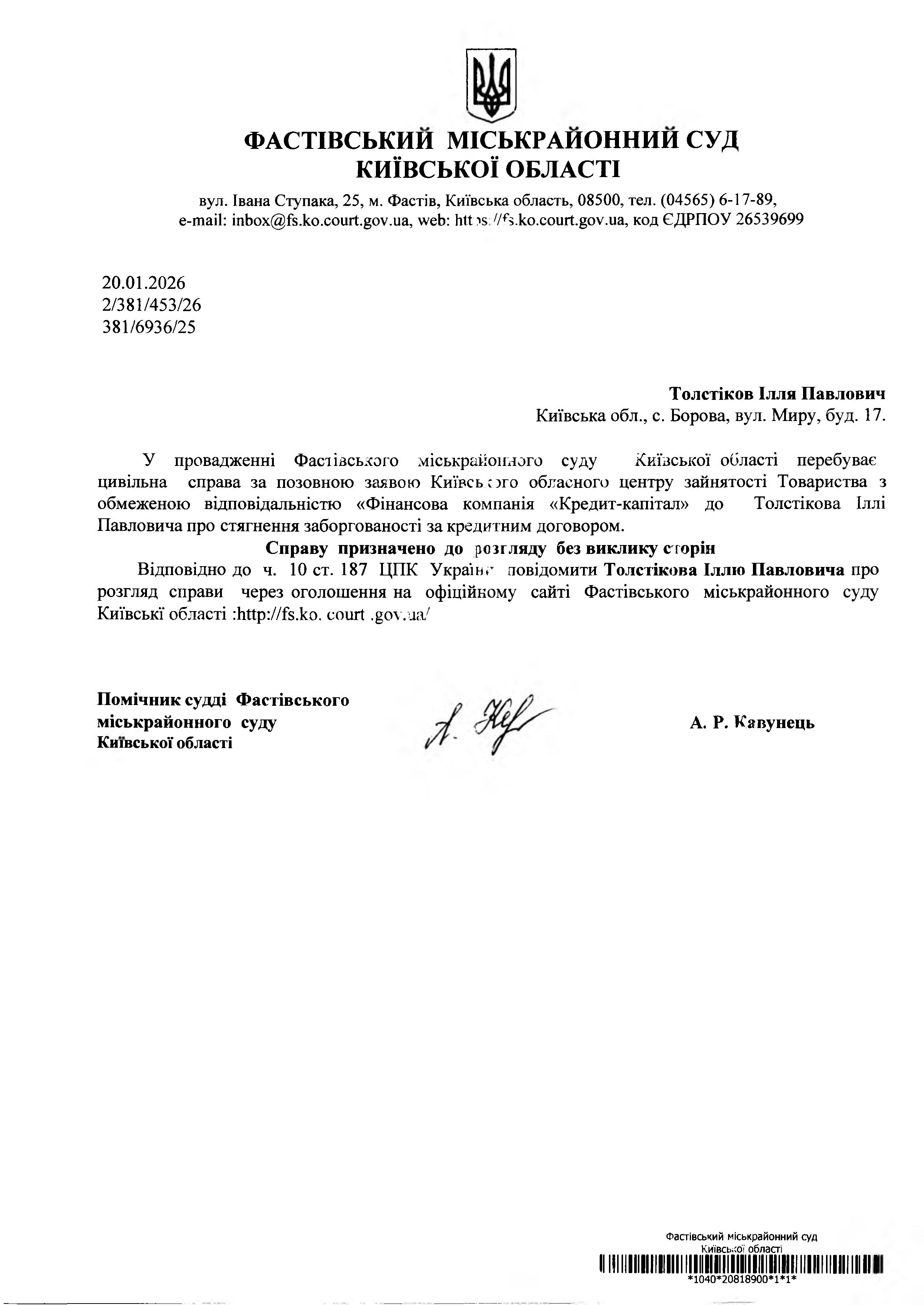 Толстіков Ілля Павлович Київська обл., с. Борова, вул. Миру, буд. 17.