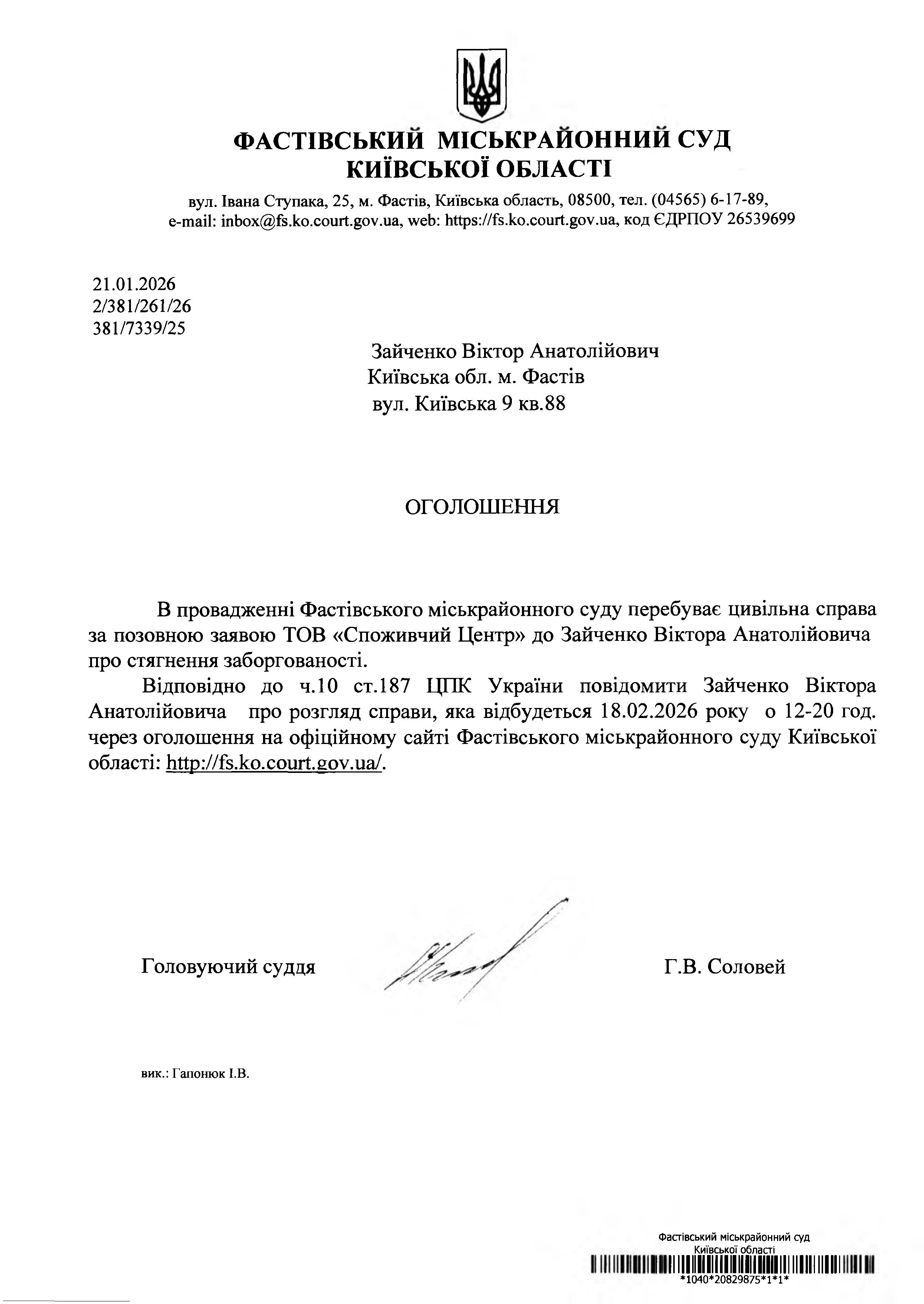 Зайченко Віктор Анатолійович Київська обл. м. Фастів вул. Київська 9 кв.88