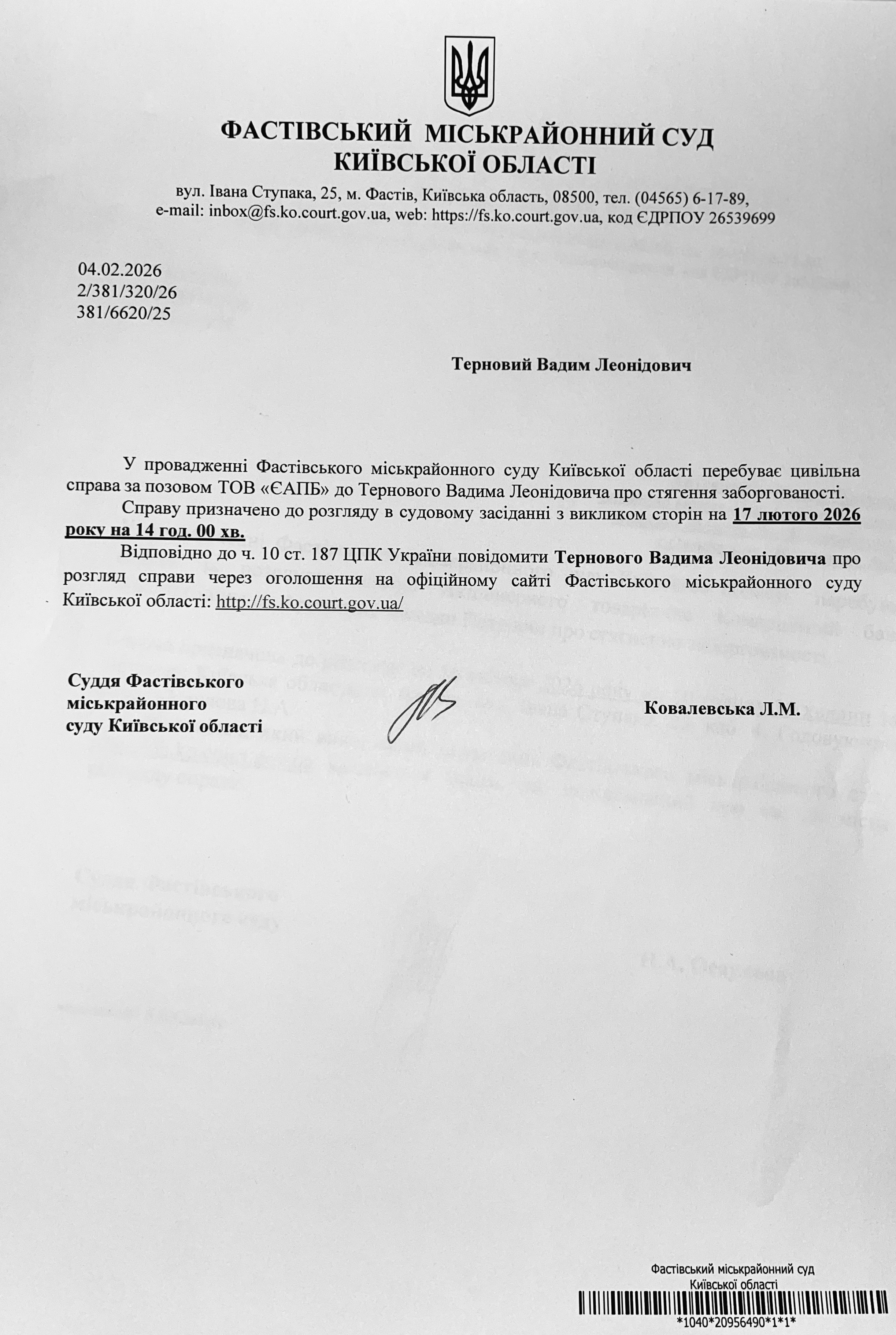 Фастівський міськрайонний суд Київської області викликає Тернового Вадима Леонідовича