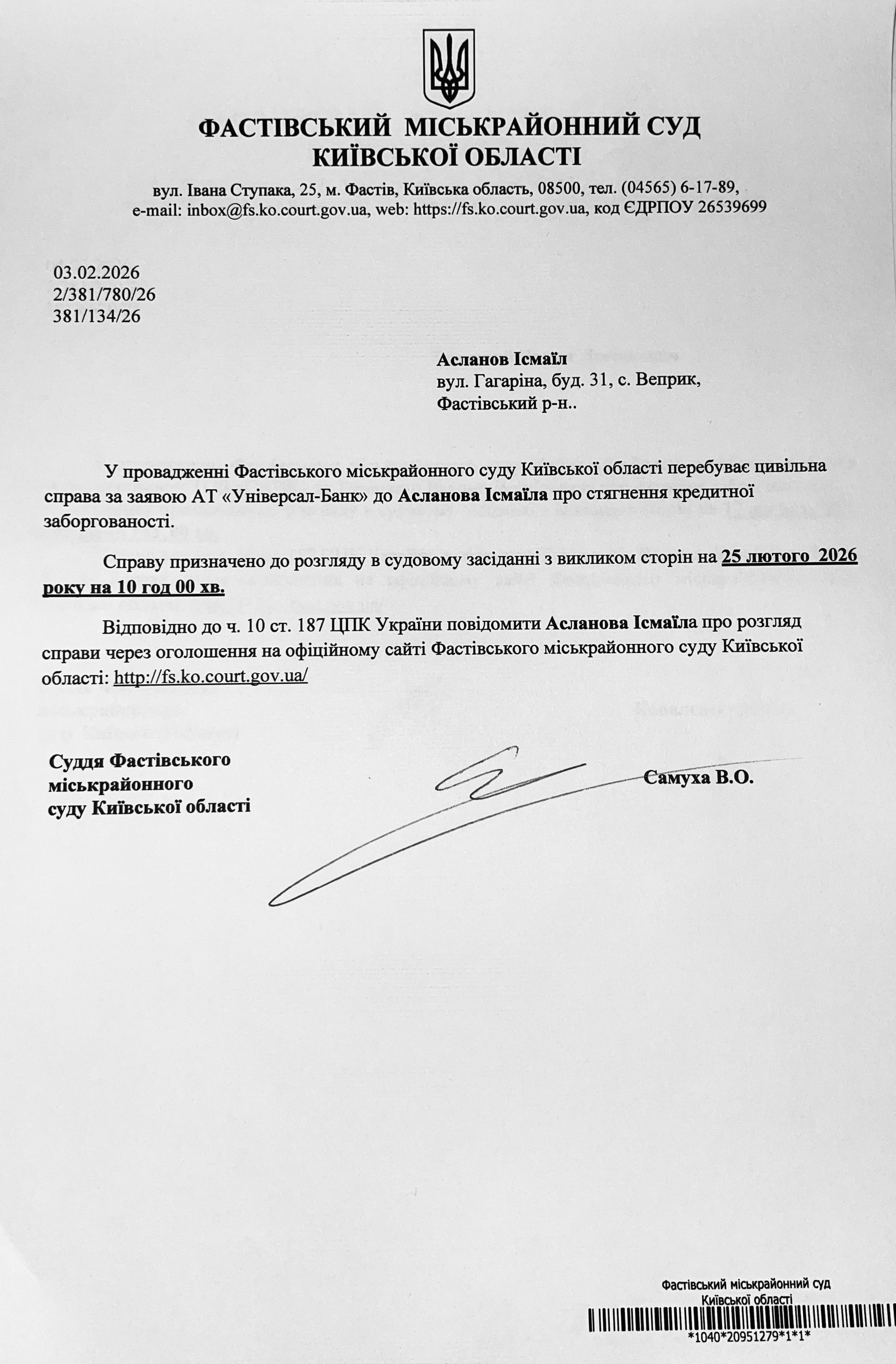 Фастівський міськрайонний суд Київської області викликає Асланова Ізмаїла
