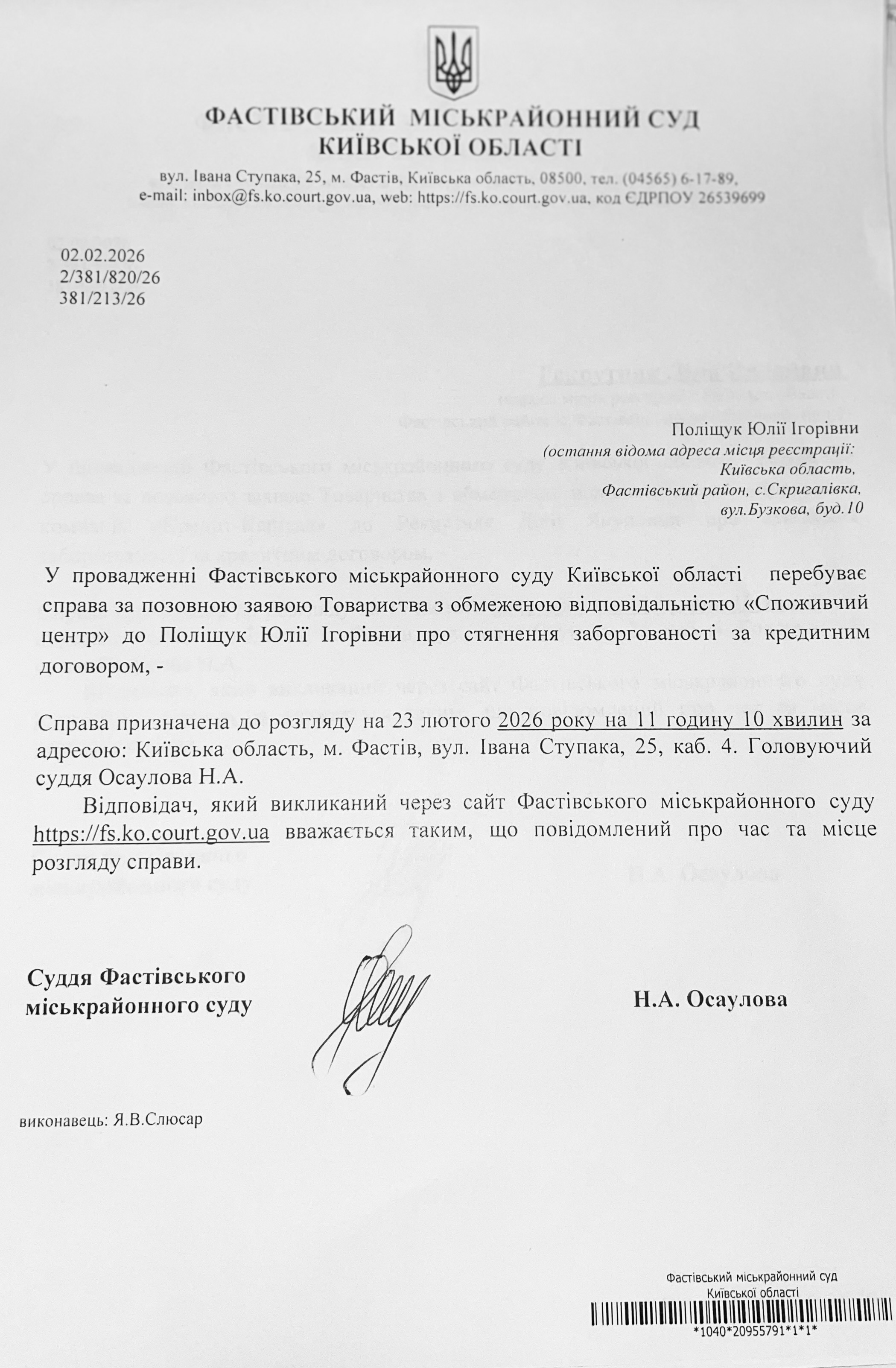 Фастівський міськрайонний суд Київської області викликає Поліщук Юлію Ігорівну